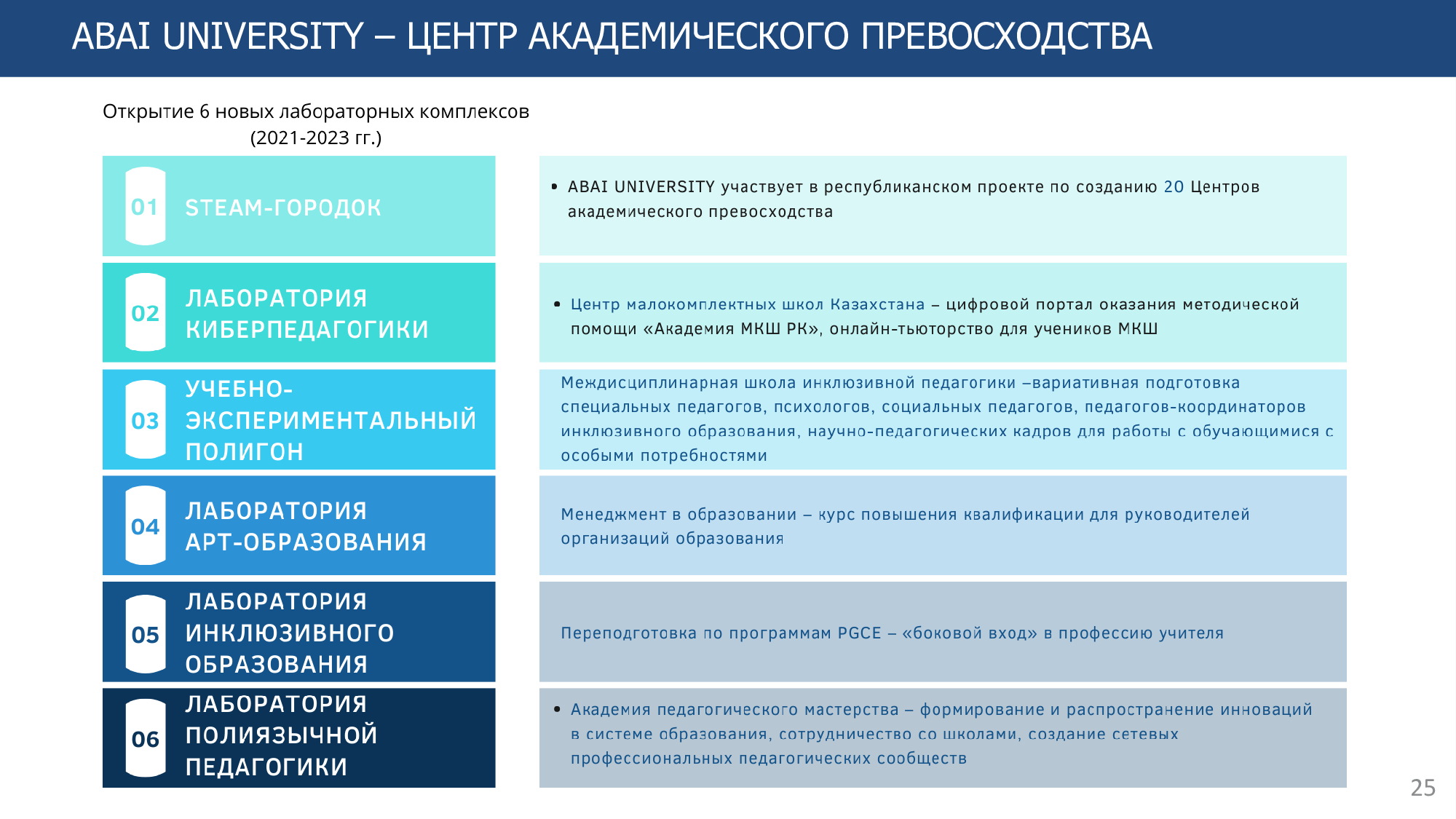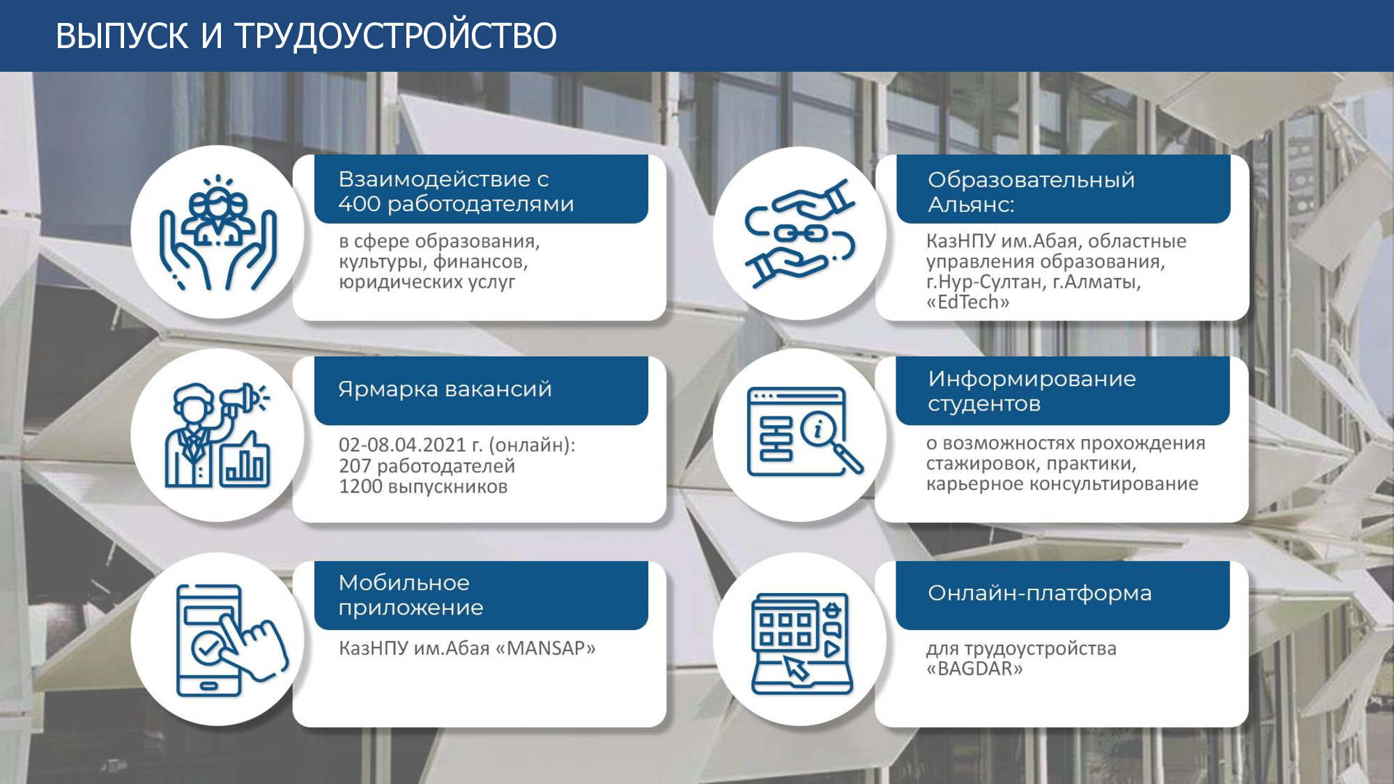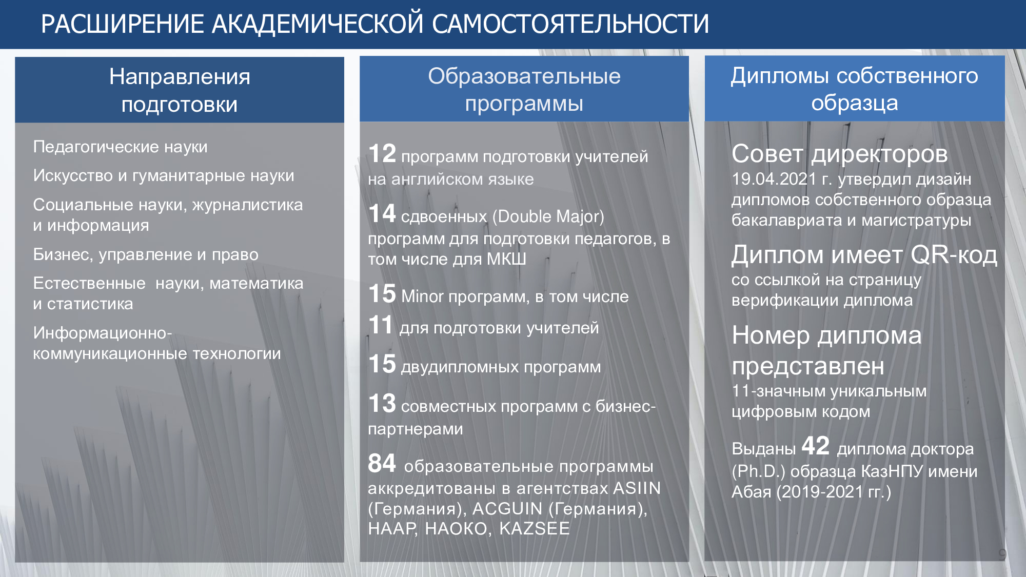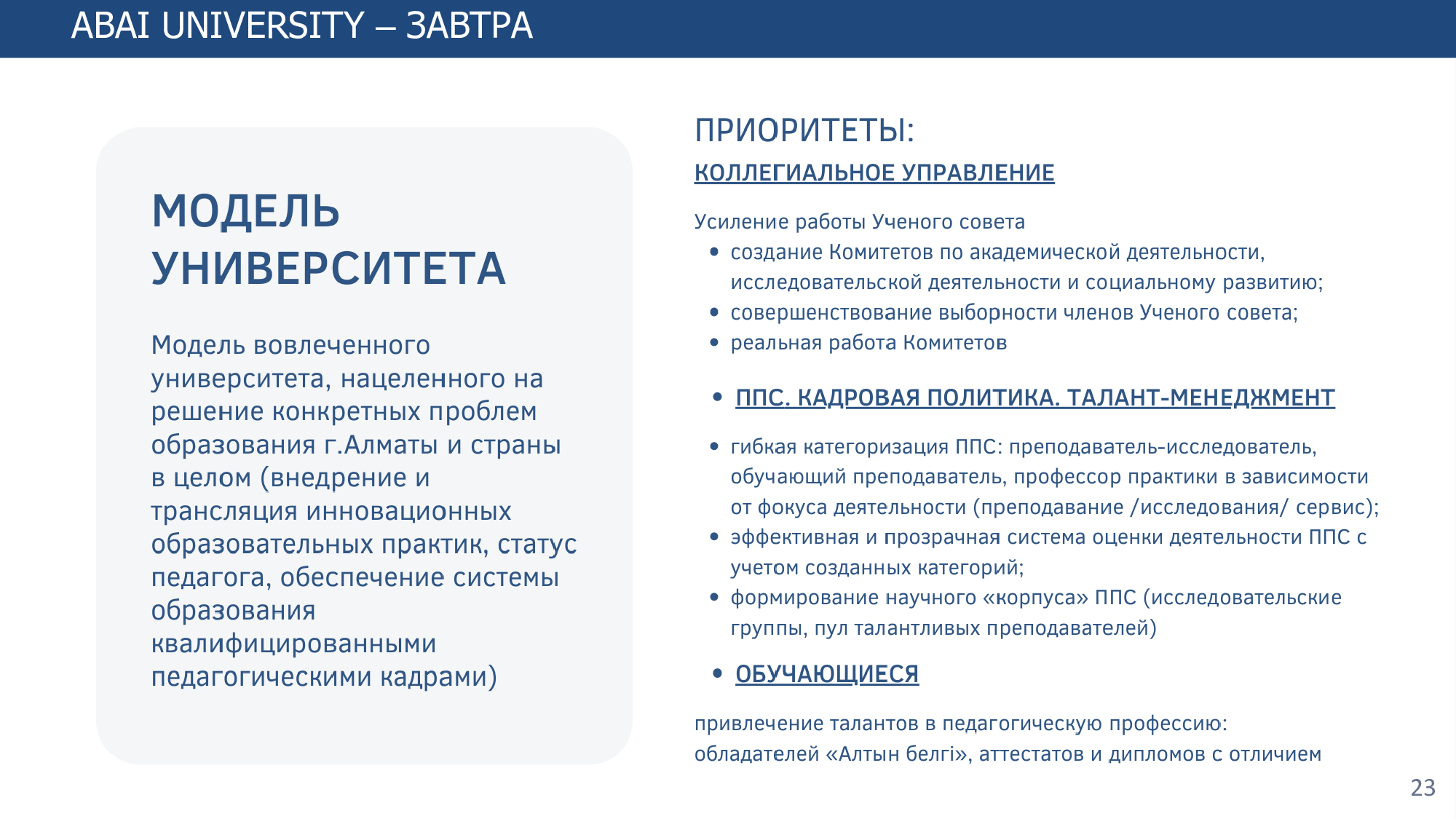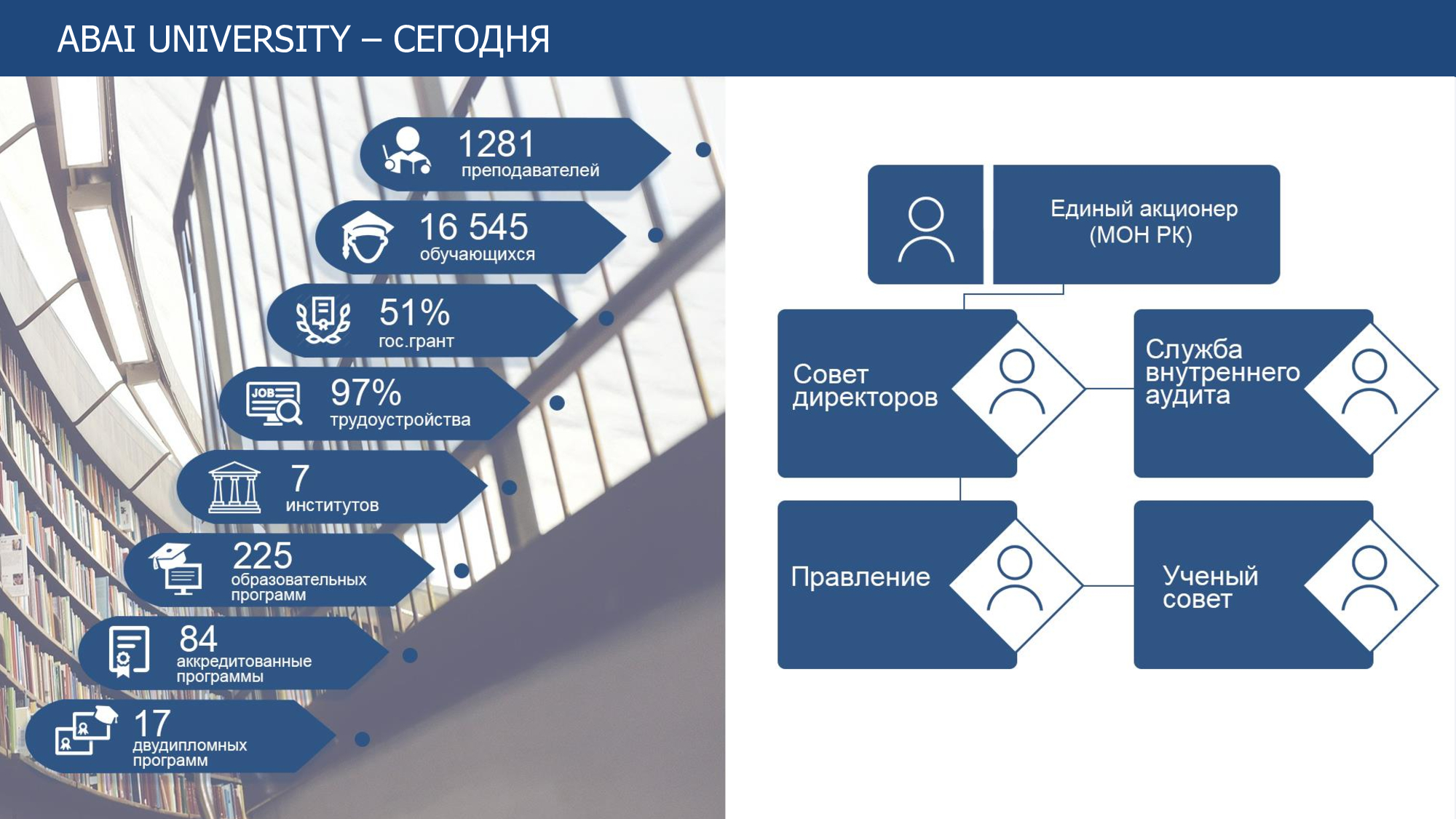 Основанный в 1928 году сегодня КазНПУ имени Абая - ведущий вуз страны, готовящий учителей и научные кадры практически для всех отраслей экономики. Высокое качество образования, достойное место среди лучших вузов РК и первое место в рейтинге педагогических университетов позволяют ставить и решать важнейшие задачи по подготовке высококвалифицированных специалистов, способных найти свое место на рынке труда. Многие из них будут определять дальнейшую стратегию развития Казахстана и представлять его на мировой арене.