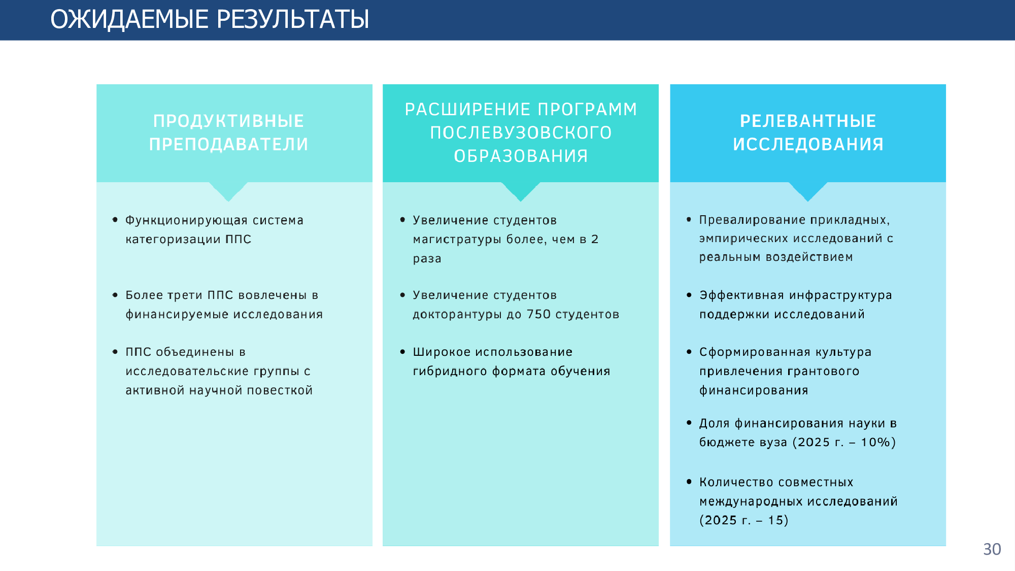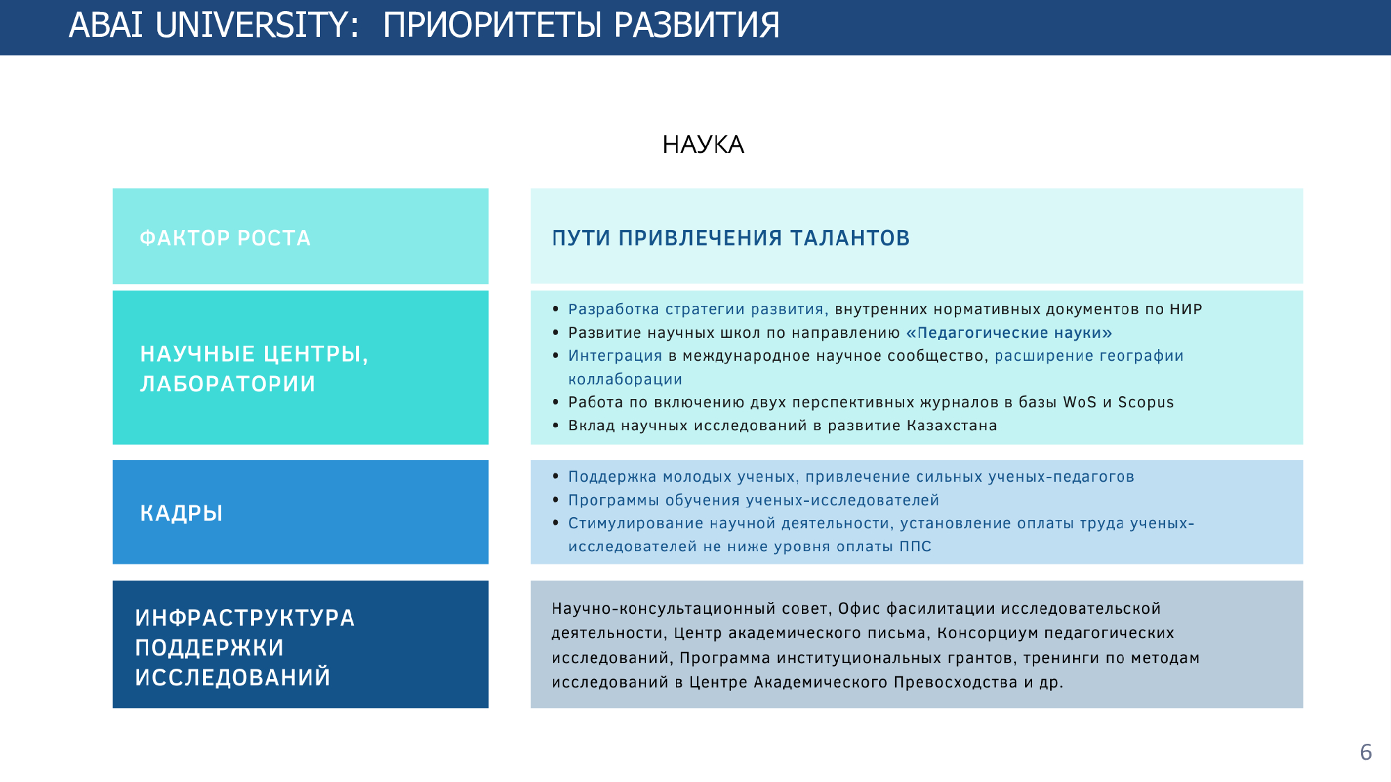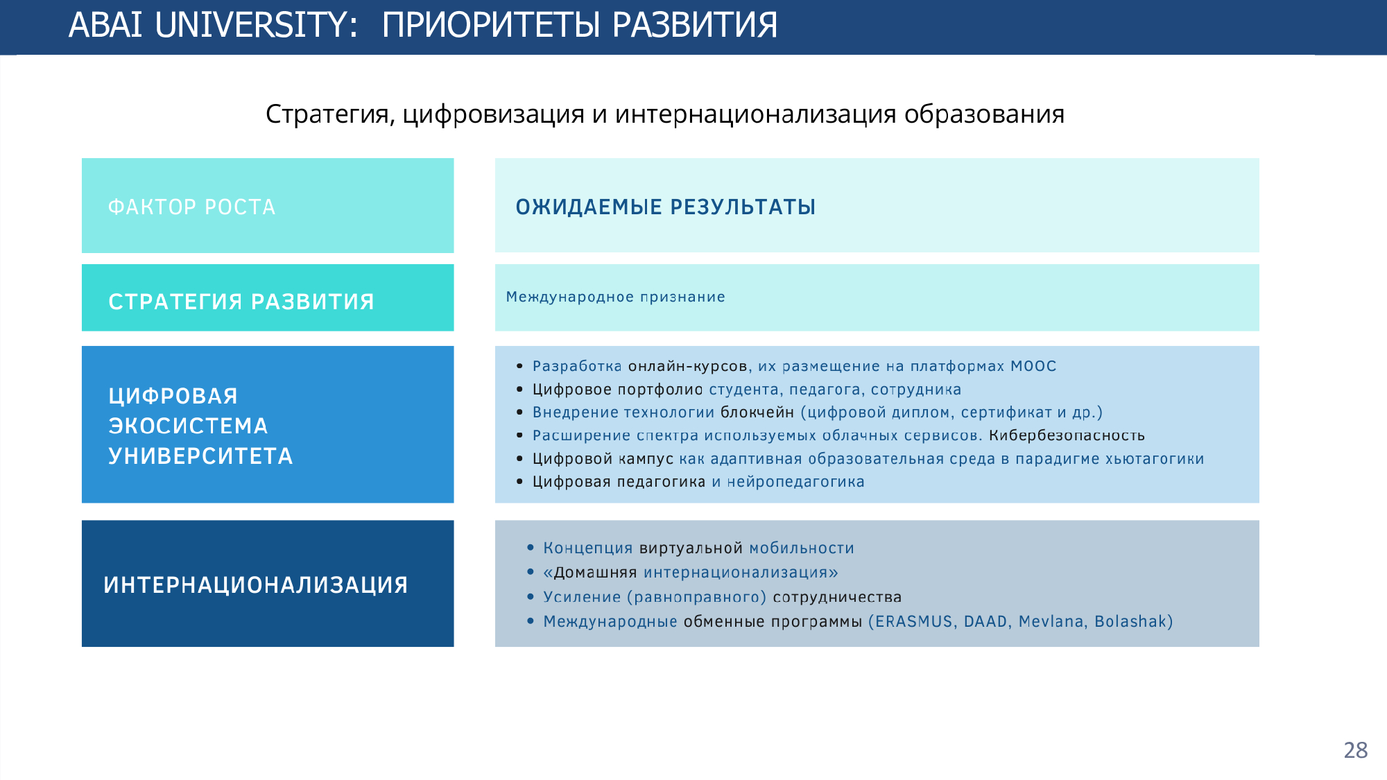 Согласно Стратегии развития на 2022-2025 годы определены восемь основных направлений и стратегические индикаторы, для достижения которых предполагается увеличение доли штатного ППС, участвующего в научных исследованиях, до 33%, ППС по публикациям в международных журналах, индексируемых в базах Web оf Science и Scopus, до 20%, долю обучающихся в магистратуре и докторантуре - до 15%, количества совместных международных исследований - до 7, доли иностранных студентов - до 5%, числа привлеченных иностранных преподавателей - до 10 человек, количества двудипломных образовательных программ - до 20.