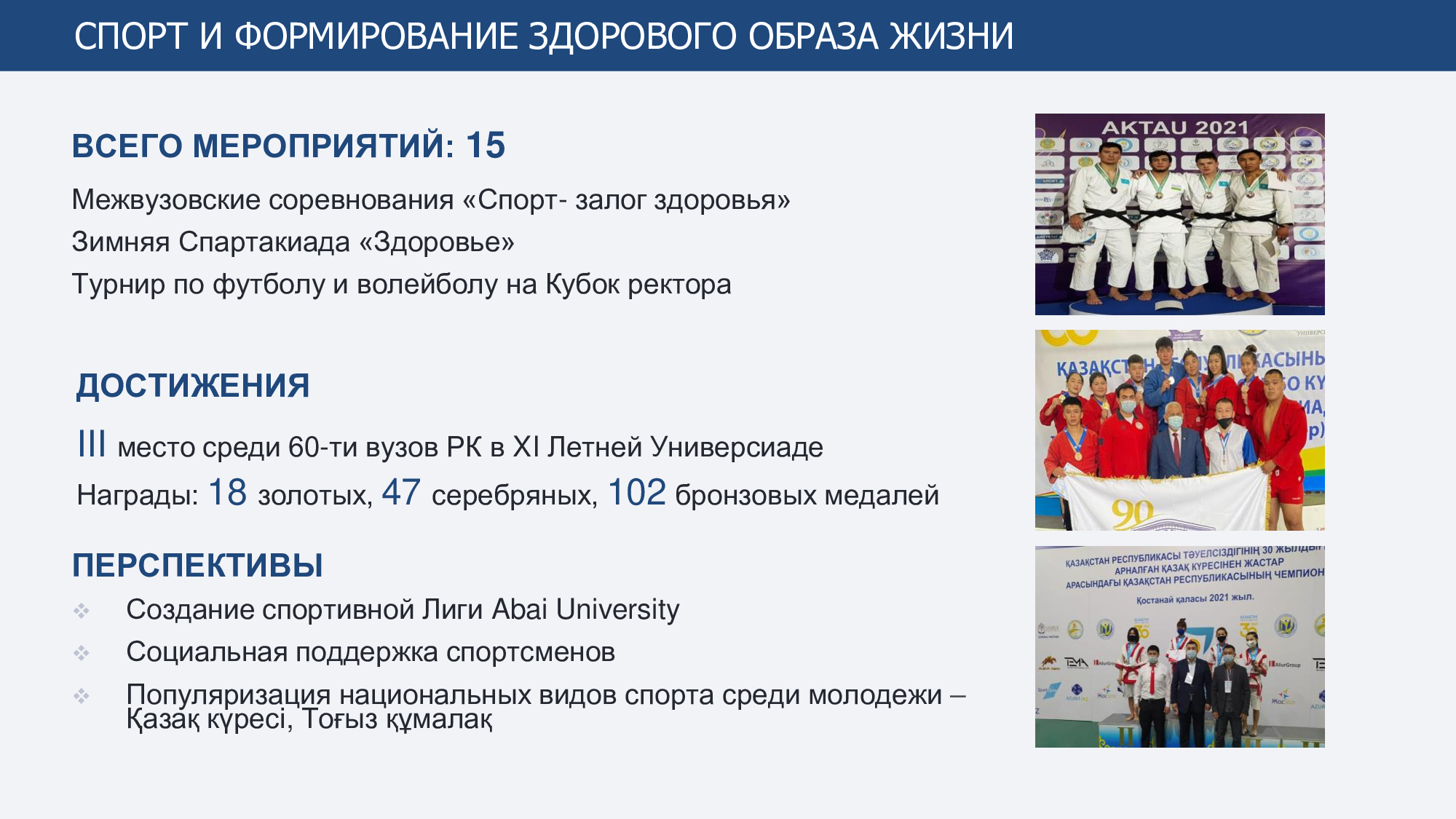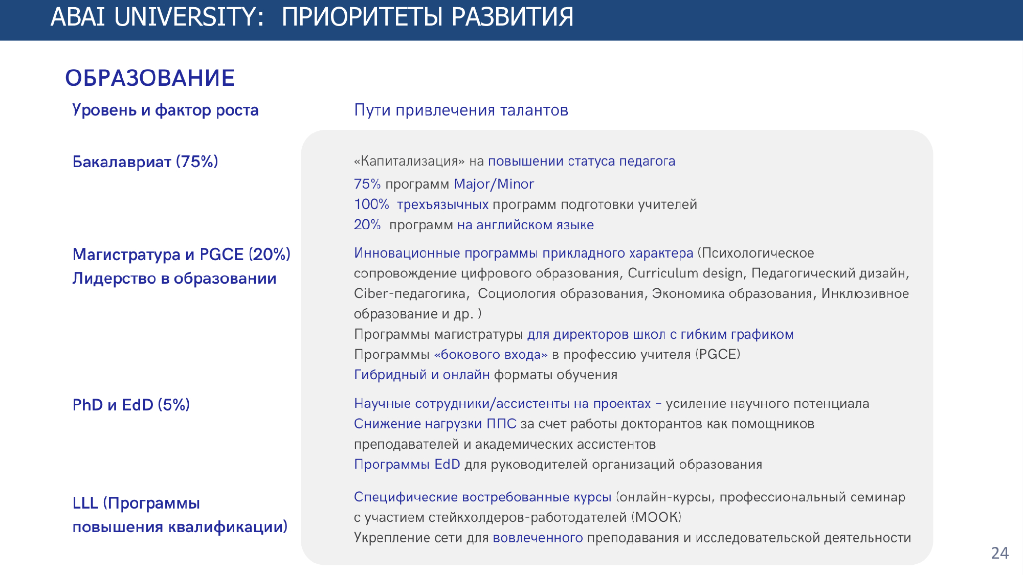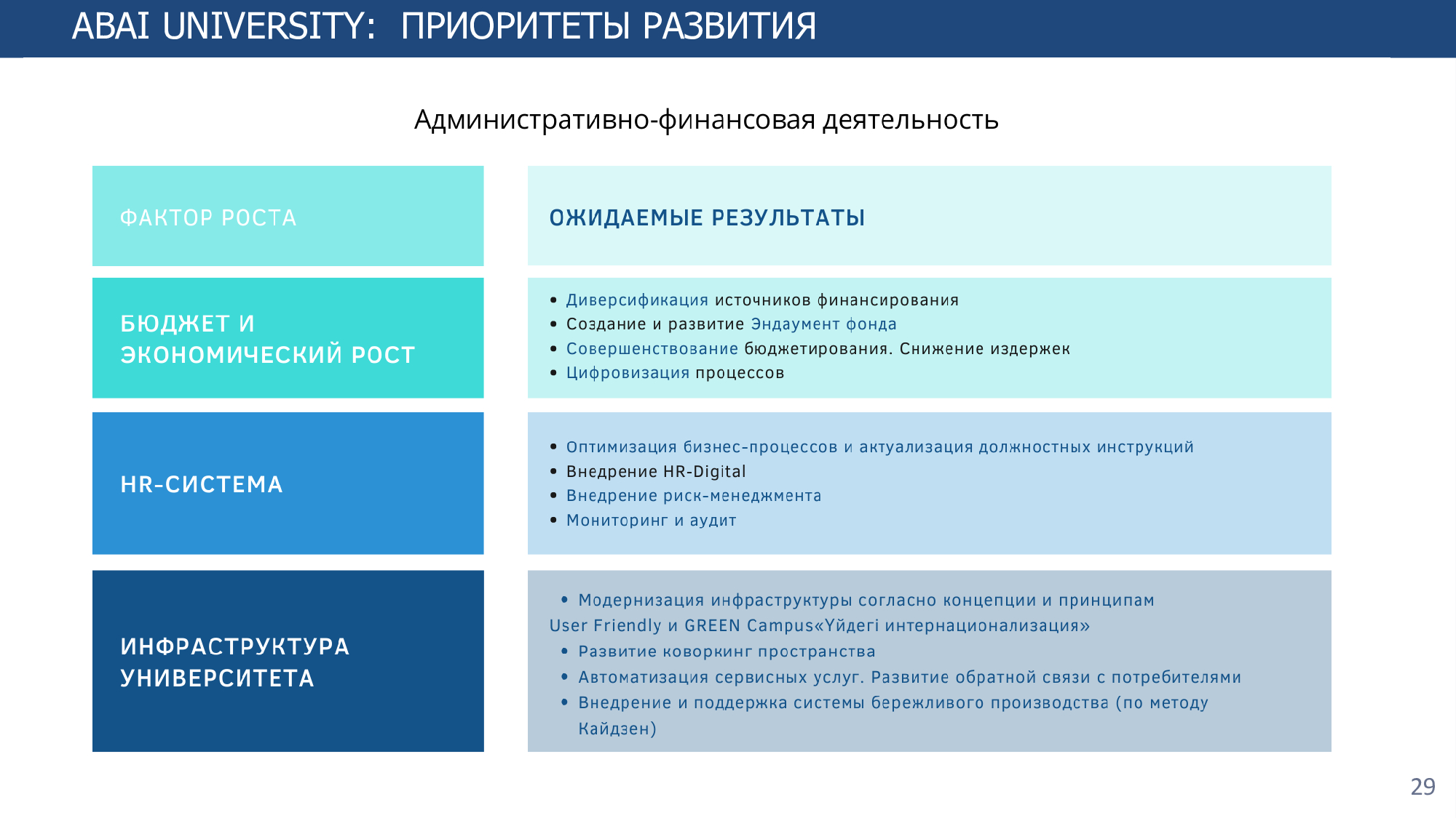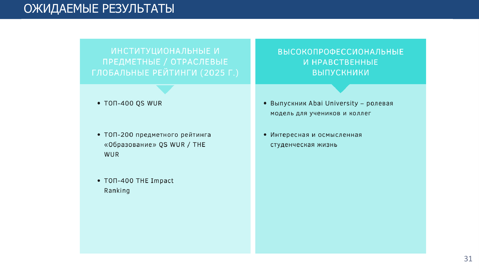 Согласно Стратегии развития на 2022-2025 годы определены восемь основных направлений и стратегические индикаторы, для достижения которых предполагается увеличение доли штатного ППС, участвующего в научных исследованиях, до 33%, ППС по публикациям в международных журналах, индексируемых в базах Web оf Science и Scopus, до 20%, долю обучающихся в магистратуре и докторантуре - до 15%, количества совместных международных исследований - до 7, доли иностранных студентов - до 5%, числа привлеченных иностранных преподавателей - до 10 человек, количества двудипломных образовательных программ - до 20.