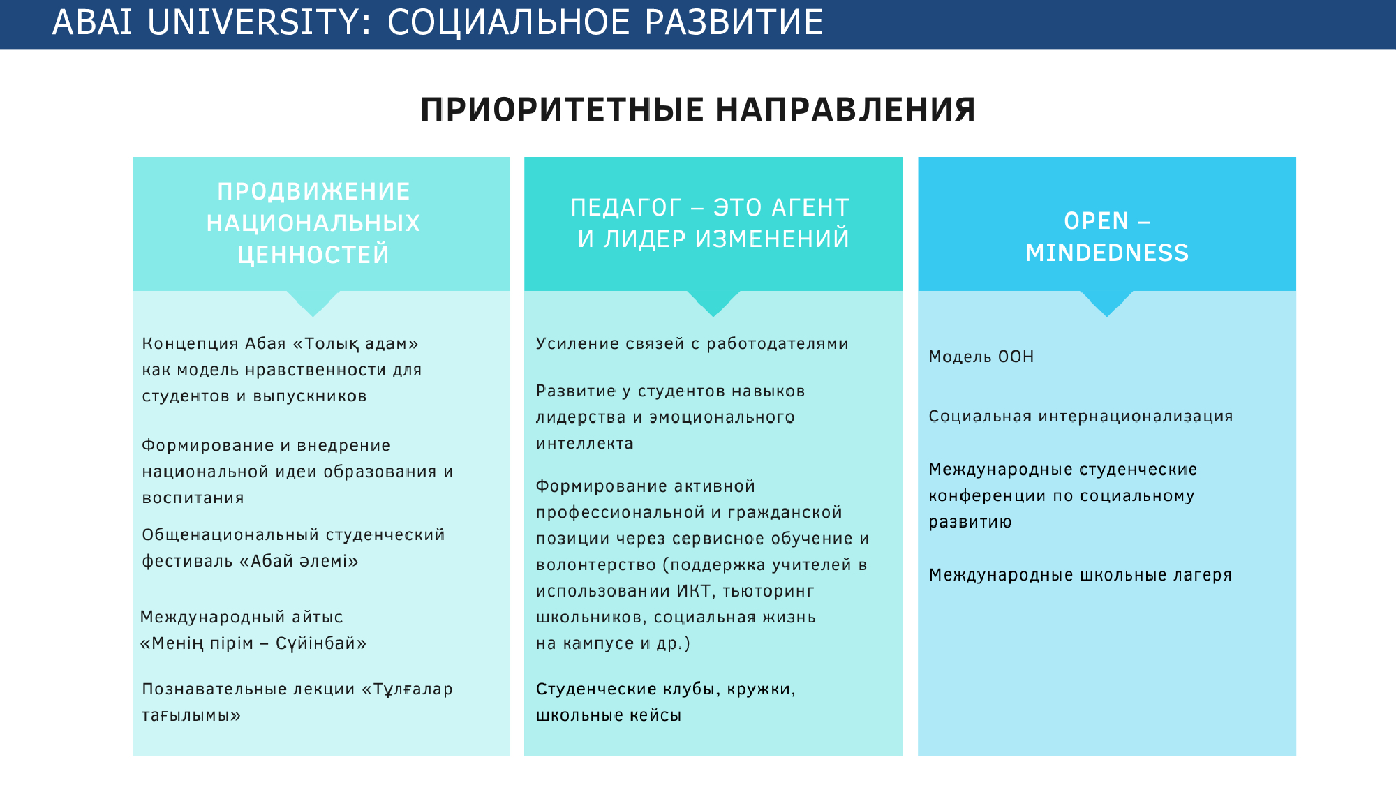 Одной из культурно-просветительских инициатив университета является популяризация культурного наследия великого казахского поэта и мыслителя Абая Кунанбаева. Наш вуз инициировал открытие шести образовательных центров имени Абая в ряде стран: в Поморской Академии г. Слупск, Польша; в Илийском педуниверситете, КНР; в Хошиминском педагогическом университете (Вьетнам); в Эрзинджанском университете (Турция); в Ханойском национальном педагогическом университете (Вьетнам); в Московском педагогическом государственном университете (Россия). Их миссия - популяризация наследия Абая, проведение различных мероприятий по страноведению, культуре и истории Казахстана. Деятельность этих центров способствует интеграции в международное научно-образовательное пространство, реализации имиджевой политики и росту авторитета КазНПУ имени Абая за рубежом.