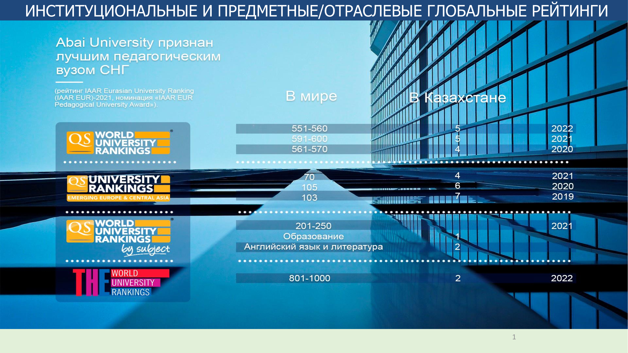 КазНПУ имени Абая ежегодно улучшает свои позиции среди ведущих вузов мира. По итогам QS World University Rankings-2022 года занимает позицию #551-560. (2021 г.-#601-650, 2020 г.-#561-570). Среди вузов страны - пятое место. В международном рейтинге QS EECA-2022 (Emerging Europe & Central Asia) университет удостоен 70-го места среди 450 вузов региона по странам Восточной Европы и Центральной Азии. Abai University вошел в топ-1000 глобального рейтинга RankPro Worldwide Professional University Rankings, заняв 917 место из зарегистрированных 2425 вузов мира. По итогам QS World University Rankings by Subject 2022 Abai University впервые вошел в первую сотню университетов мира по предметному рейтингу - 62 место по специальности «Образование и обучение» (Education and Training) в категории «Социальные науки и менеджмент» с 71,6 балла. Этот показатель является наилучшим как среди казахстанских, так и Центрально-Азиатских вузов, представленных в данной категории. Кроме того, университет впервые вошел в отраслевой рейтинг «Искусство и гуманитарные науки», заняв 297 место с общим баллом 64,5. В этой категории специальность «Лингвистика» занимает позицию 201-250 в мире (среди вузов РК 3-е место).
