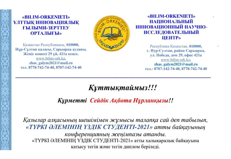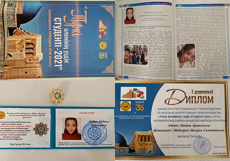 В октябре 2021 года в Нур-Султане Национальный инновационный научно-исследовательский центр «Bilim-orkenieti» в честь 30-летия Независимости РК провел республиканский конкурс «Лучший студент тюркского мира-2021». В нем приняли участие студентки 3-го курса Института естествознания и географии по специальности «Биология» Айдын Айдана и Сейдик Акбота, написавшие эссе на тему «Мои достижения в студенческой жизни». По решению жюри они стали победителями конкурса за вклад в развитие молодежной политики Казахстана, награждены дипломом 1 степени, нагрудными знаками и специальным свидетельством