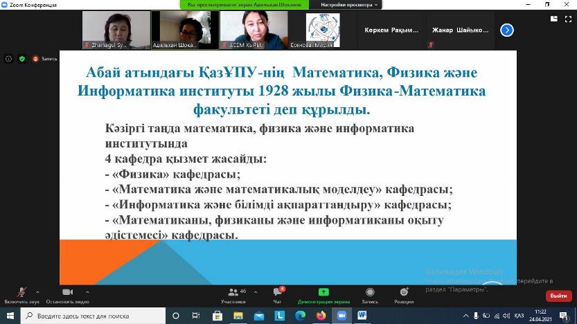 В соответствии с планом «Профориентационная работа» КазНПУ имени Абая и Института математики, физики и информатики на 2020-2021 учебный год кафедра методики преподавания математики, физики и информатики 24 апреля 2021 года на сайте вуза провела акцию «Открытые двери».
