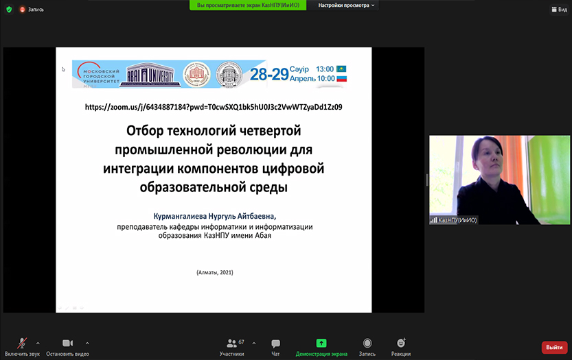 28-29 апреля 2021 года Международной научной лабораторией проблем информатизации образования и образовательных технологий КазНПУ имени Абая проведен международный научно-методический вебинар-круглый стол «Разработка системы подготовки педагогов к обучению и воспитанию школьников в условиях цифровизации общества».