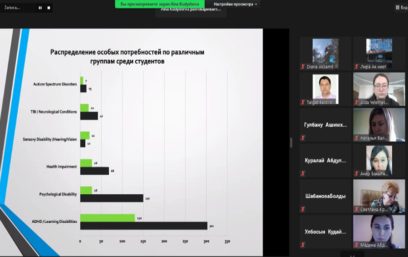 27 апреля 2021 года прошел Международный онлайн-круглый стол «Вопросы профессиональной подготовки специальных педагогов в Республике Казахстан и за рубежом». В заседании приняли участие 6 докладчиков и более 90 отечественных и зарубежных специалистов.