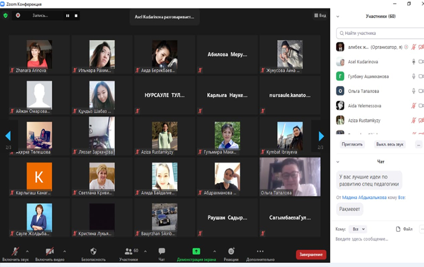 Модераторы - докторанты первого года обучения специальности «8D01901-Подготовка специалистов по специальной педагогике» КазНПУ имени Абая Ашимханова Гулбану, Кударинова Асель и Сатимбекова Аида.