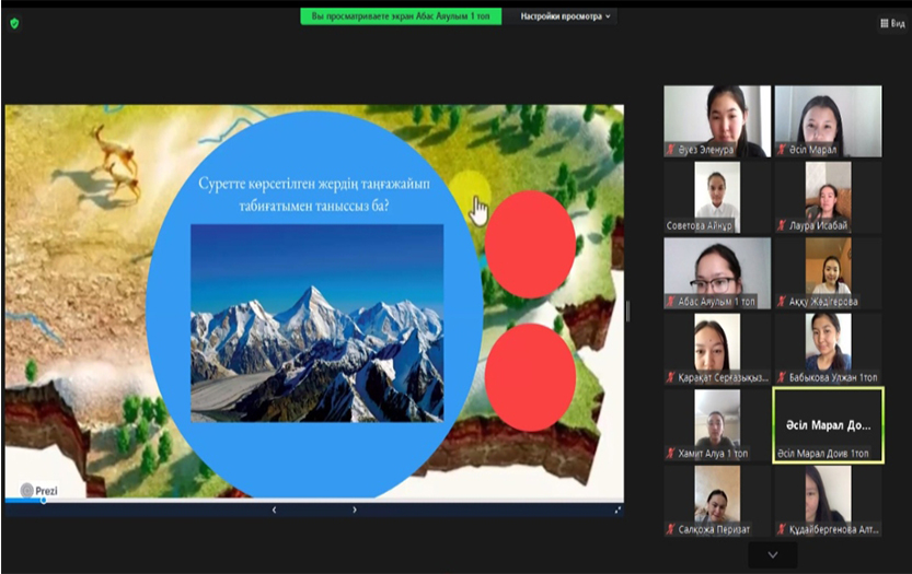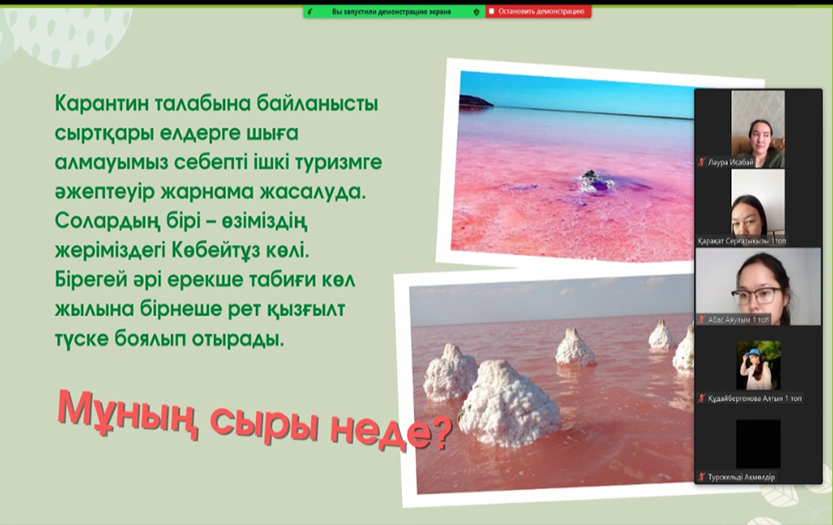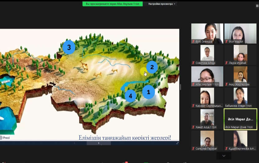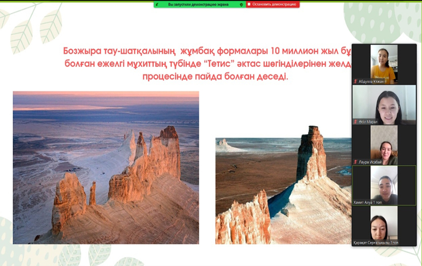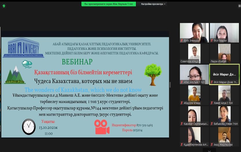 В вебинаре приняли участие преподаватели, педагоги дошкольных организаций, магистранты и студенты. На вебинаре, проведенном на основе дисциплины «Методика ознакомления дошкольников с окружающей средой», студенты познакомили гостей с уникальными достопримечательностями Казахстана и рассказали об их «тайной истории». Опытный педагог дошкольной организации №144 Калибекова Гульназ поделилась своим опытом в проведении предмета «Ознакомление с окружающей средой», ответила на вопросы студентов. Участники мероприятия активно обсудили подготовленный видео-урок «Обновленное содержание образования». Студенты выразили признательность за интересный и увлекательный вебинар, основанный на познавательной цели.