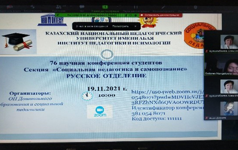 В 76-й научной студенческой конференции КазНПУ им. Абая, которая проводится ежегодно по специальностям «5В102300-Социальная педагогика и самопознание» (рус. отд.) ОП «Дошкольное образование, социальная педагогика и самопознание» Института педагогики и психологии, участвовало 20 студентов. Торжественное открытие мероприятия состоялось 20 ноября 2021 года на платформе ZOOM.