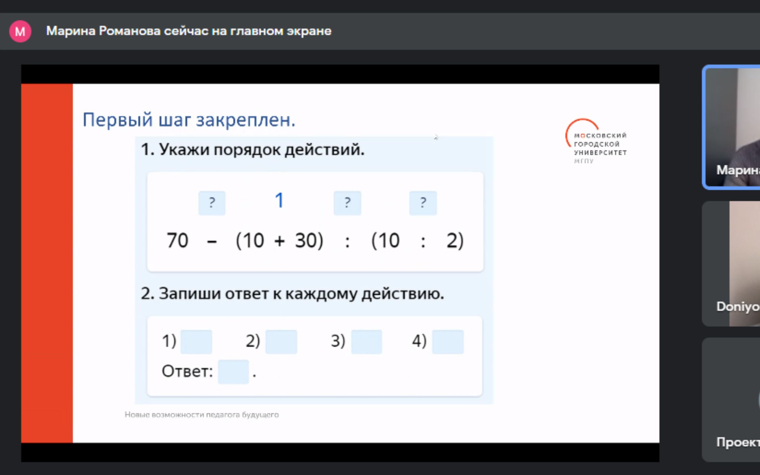 Проблема «Цифровой контент как средство организации практической подготовки студентов в сетевом формате» была поднята старшим преподавателем кафедры педагогики и психологии начального образования ВСГПУ (Волгоград, Россия) Козюлиной Е.О. Педагог поделилась опытом создания онлайн-контента по дисциплине «Психология», показала алгоритм создания заданий для студентов. В процессе своего выступления предлагала присутствующим ответить на вопросы по теме, выполнить задания.