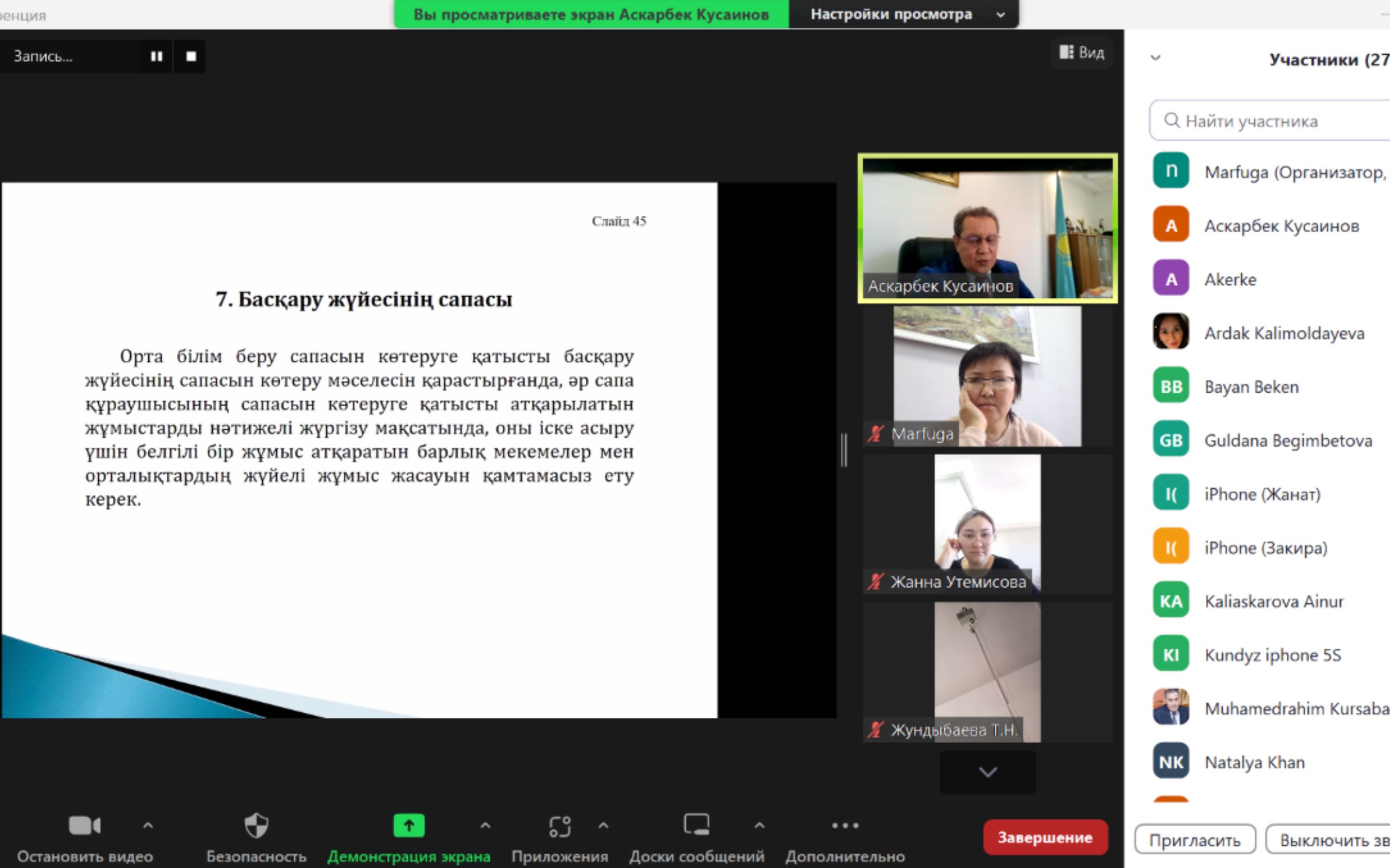 Институт педагогики и психологии в рамках работы Онлайн-лектория организовал лекцию доктора педагогических наук, профессора КазНПУ имени Абая Кусаинова Аскарбека на тему «Научно-практические основы повышения качества образования сельских школ». Были затронуты вопросы качества образования в Казахстане в целом, а также некоторые пути повышения повышения качества образования сельских школ. А.К.Кусаинов, являясь основоположником сравнительной педагогики в Казахстане, в ходе лекции продемонстрировал свои новейшие учебники и личные взгляды по проблеме учебниковедения. В рамках онлайн-лектория участники мероприятия не оставили в стороне и вопросы малокомплектных школ, где требуется особая подготовка учителя.