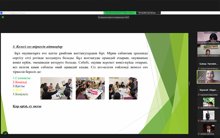 С вступительной речью мероприятие открыла директор института Г.А.Абаева, подчеркнув актуальность молодежной научной среды. В семинаре приняли участие докторанты и их научные руководители. Модератором выступила докторант 3-го курса специальности «Педагогика и методика начального обучения» Садибекова С.С. На основе своих научных докладов докторанты 3-го курса специальностей «8D01901-Специальная педагогика» Жигитов А.Б., Сатимбекова А.А. и «8D01301-педагогика и методика начального обучения» Сарсенбаева Г.Х., Садибекова С.С., Абжанова С.С., Зулпыхарова М.М. поделились результатами исследования. Состоялось и обсуждение методической работы.