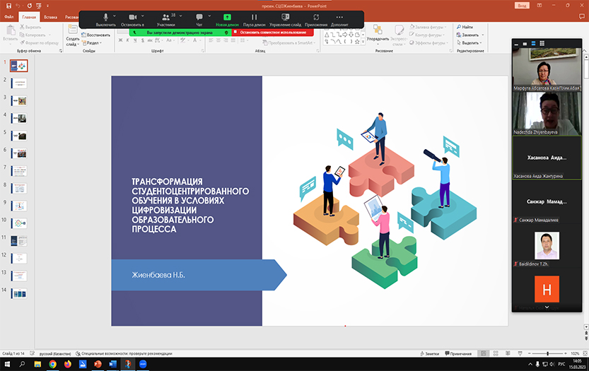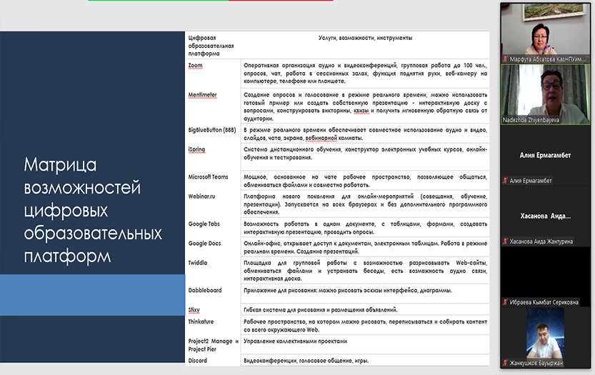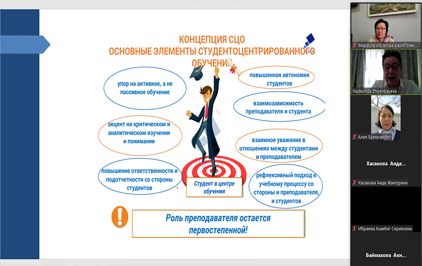 Институт педагогики и психологии в рамках работы своего Онлайн-лектория организовал лекцию доктора психологических наук, профессора КазНПУ имени Абая Надежды Жиенбаевой на тему «Трансформация студентоцентрированного обучения в условиях цифровизации образовательного процесса». Были рассмотрены концепция, основные элементы такой формы обучения, дидактический тетраэдр, возможности цифровых платформ.