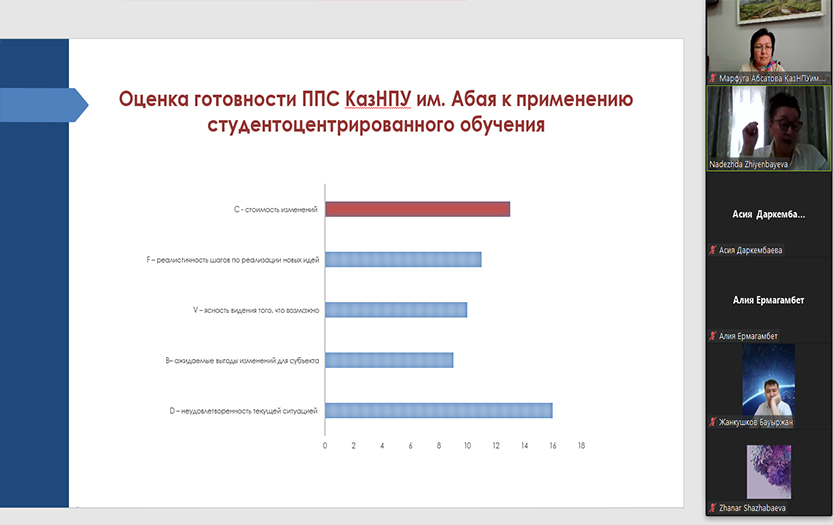 Участники мероприятия были ознакомлены с результатами проведенной диагностики, направленной на изучение реального состояния готовности ППС КазНПУ им .Абая к реализации студентоцентрированного обучения.