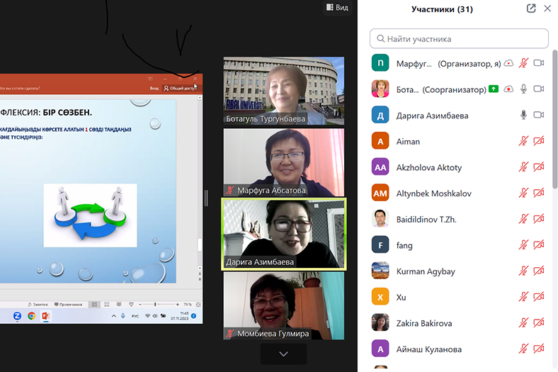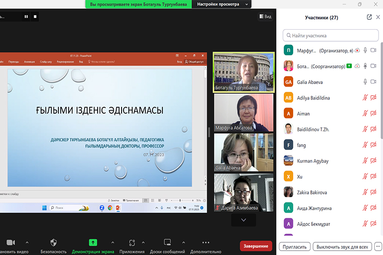 7 ноября 2023 года состоялась лекция профессора кафедры педагогики и психологии Института педагогики и психологии КазНПУ имени Абая Тургунбаевой Ботагуль для докторантов на тему «Методология научного поиска». С приветственным словом выступила директор института Абаева Галия и пожелала всем плодотворной работы.