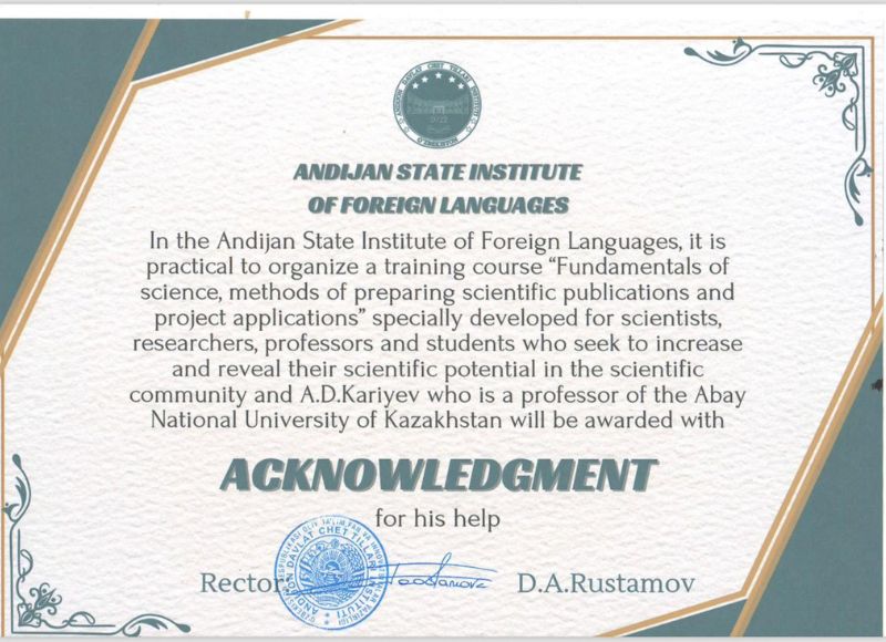 Руководители Андижанского вуза отметили высокий уровень профессионализма Адлета Кариева, выразили признательность за активное участие в учебном и научно-методическом процессе института, вручив благодарственное письмо.