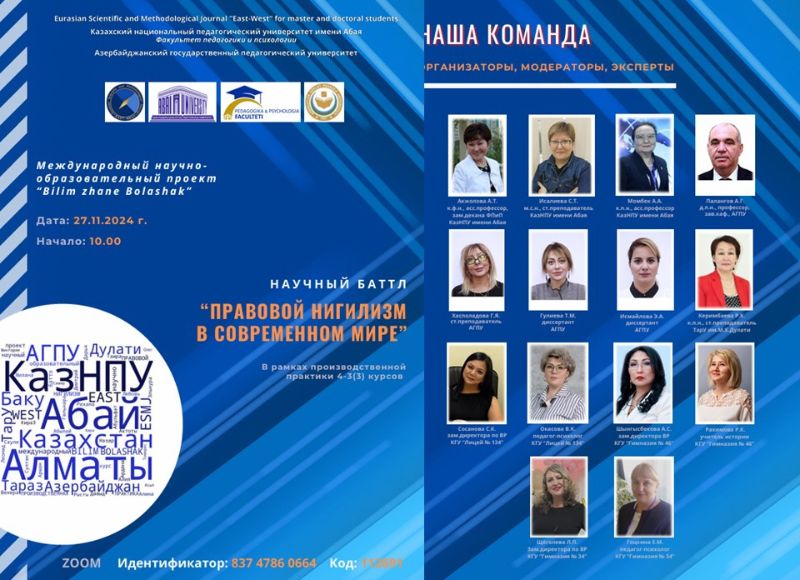 Научное мероприятие состоялось в офлайн-онлайн формате в рамках международного научно-образовательного проекта «Bilim zhane Bolashak», организаторы - Факультет педагогики и психологии (Актоты Акжолова, Сауле Исалиева), Факультет искусств (Алия Момбек), Eurasian Scientific and Methodological Journal "East-West" for master and doctoral students, Азербайджанский государственный педагогический университет (Абульфат Палангов, Гульнара Хасполадова), Городской научно-методический центр новых технологий в образовании Управления образования г.Алматы (Акмагамбетова Р.Г.), КГУ «Лицей № 134» (Сауле Сосанова, Венера Окасова).