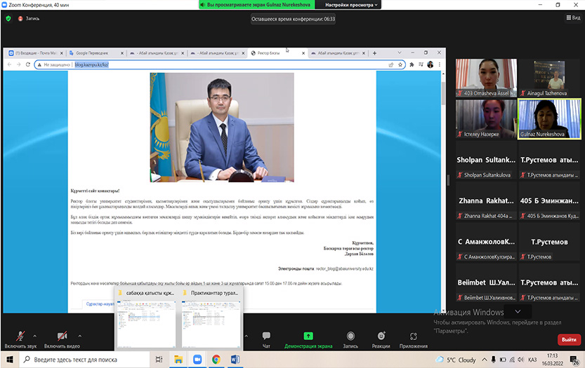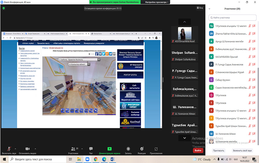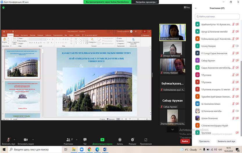 Нурекешова Г.Р. сделала общий обзор с сайта нашего университета по виртуальному 3D-туру, акцентировав внимание на специальностях, которые имеются в КазНПУ имени Абая и на достижениях вуза с момента его основания. Были использованы тематические слайды.