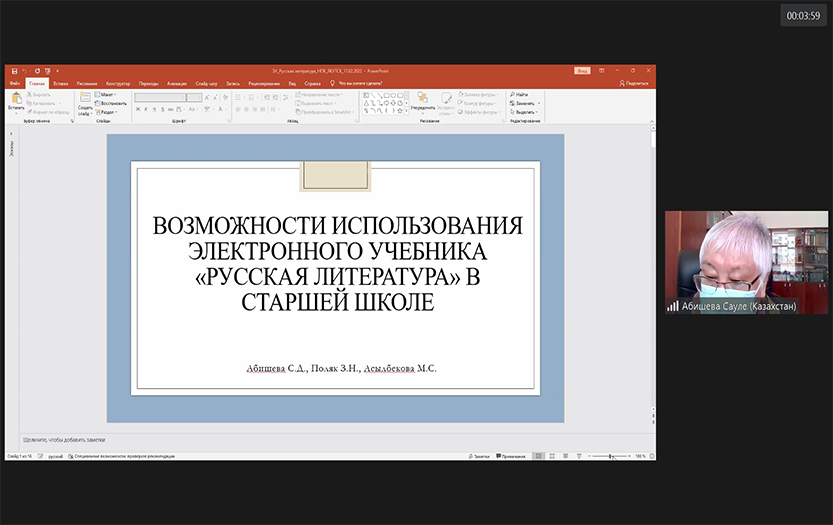 С докладом на секции «Проблемы гуманизации и гуманитаризации образования в современных условиях» выступила заведующая кафедрой русского языка и литературы Института филологии и полиязычного образования, профессор Сауле Абишева (содокладчики - кандидат филологических наук Марина Асылбекова и доцент Зинаида Поляк). Слушателей заинтересовала тема доклада «Возможности использования электронного учебника «Русская литература» в старшей школе». При его обсуждении было высказано мнение, что платформа электронных учебников казахстанского издательства «Алматыкiтап баспасы» является одним из лидеров цифрового образования в странах СНГ.