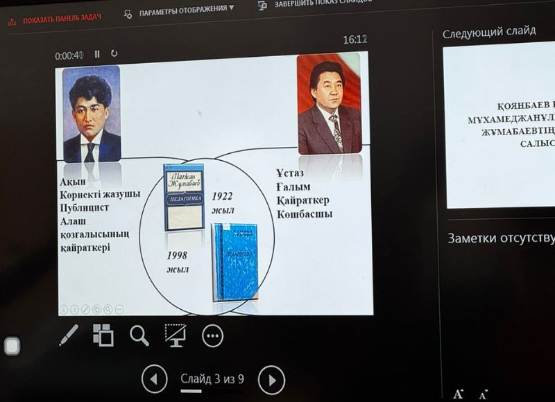 В ходе урока была представлена жизнь и творчество учителя, подробно рассмотрены его труды. Изучив труды Р. М. Коянбаева, обучающиеся провели сравнительный анализ с учебником М. Жумабаева «Педагогика».