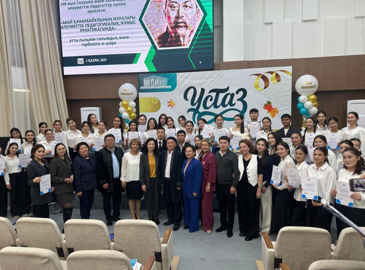 2 октября 2025 года, к Международному дню социальных педагогов, состоялось научно-познавательное и воспитательное мероприятие, посвящённое к 180-летию со дня рождения Абая.Цель мероприятия - ознакомить будущих социальных педагогов с ценными идеями, отражёнными в трудах великого мыслителя Абая, внесшего значительный вклад в развитие культуры и духовного наследия страны; пробудить у них интерес к научным исследованиям, а также способствовать процессу профессиональной социализации, основанной на культуре общения и человеческих ценностях.В ходе мероприятия студенты 1–4 курсов, обучающиеся по образовательным программам «Социальная педагогика», представили свои научные и творческие работы, а также поделились своими талантами. Под руководством Назиры Атемкуловой хор «Серпін», в составе студентов 1 курса образовательной программы 6В01802 – «Социальная педагогика» (IP), исполнил песню Абая «Желсіз түнде жарық ай» и песню посвящённую педагогам «Ұстазым».В мероприятии приняли участие приглашённые гости: к.ф.н., абаевед Жабал Шойынбет; к.ф.н., литературовед Даурен Мухамадиев, а также заведующая кафедрой дошкольного образования и социальной педагогики, кандидат педагогических наук, ассоциированный профессор Улбосын Кыякбаева и профессорско-преподавательский состав: д.п.н., профессор Кадиша Шалгынбаева, к.п.н., ст.преподаваель Гульмира Ширинбаева, м.п.н., старший преподаватель Разия Каримова. В числе организаторов – к.п.н., ассоциированный профессор Назира Атемкулова; доктора философии (PhD), ассоциированные профессора Анар Алимбекова и Асем Булшекбаева; м.п.н., преподаватели Шырын Алимжан и Сандугаш Раймкул.