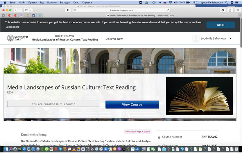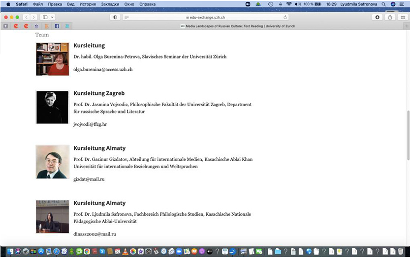 22 февраля 2022 года при поддержке Департамента науки КазНПУ имени Абая в рамках МООК на площадке Цюрихского университета стартовал совместный онлайн-курс шести ведущих вузов Швейцарии, Хорватии, России и Казахстана «Meidalanscapes of Russian Literature: Text Reading». Руководитель курса - доктор филологических наук, научный сотрудник Цюрихского университета О.Д.Буренина-Петрова, в международный преподавательский состав курса вошла доктор филологических наук, профессор-исследователь КазНПУ им. Абая Л.В.Сафронова. С казахстанской стороны данное обучение проходят магистранты и докторанты специальности «Русский язык и литература» Института филологии и полиязычного образования.