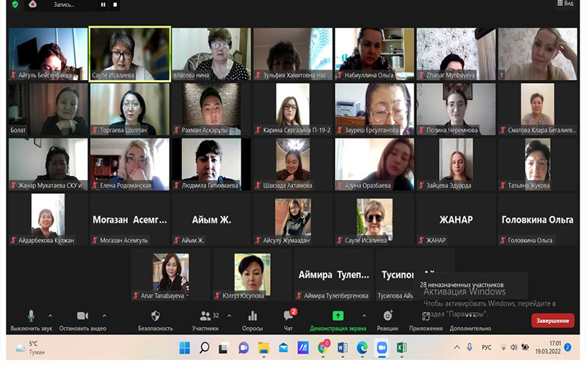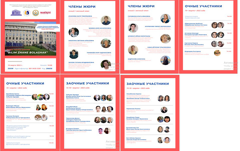 19 марта 2022 года в КазНПУ имени Абая в онлайн-формате состоялся конкурс научных проектов «Bilim zhane Bolashak». Организаторы - старший преподаватель образовательной программы «Педагогика и психология» Исалиева С.Т. и заместитель главного редактора научно-методического журнала «Педагогика и психология» Момбек А.А. при поддержке Азербайджанского государственного педагогического университета и НОД «Социальные науки» Университета Нархоз.