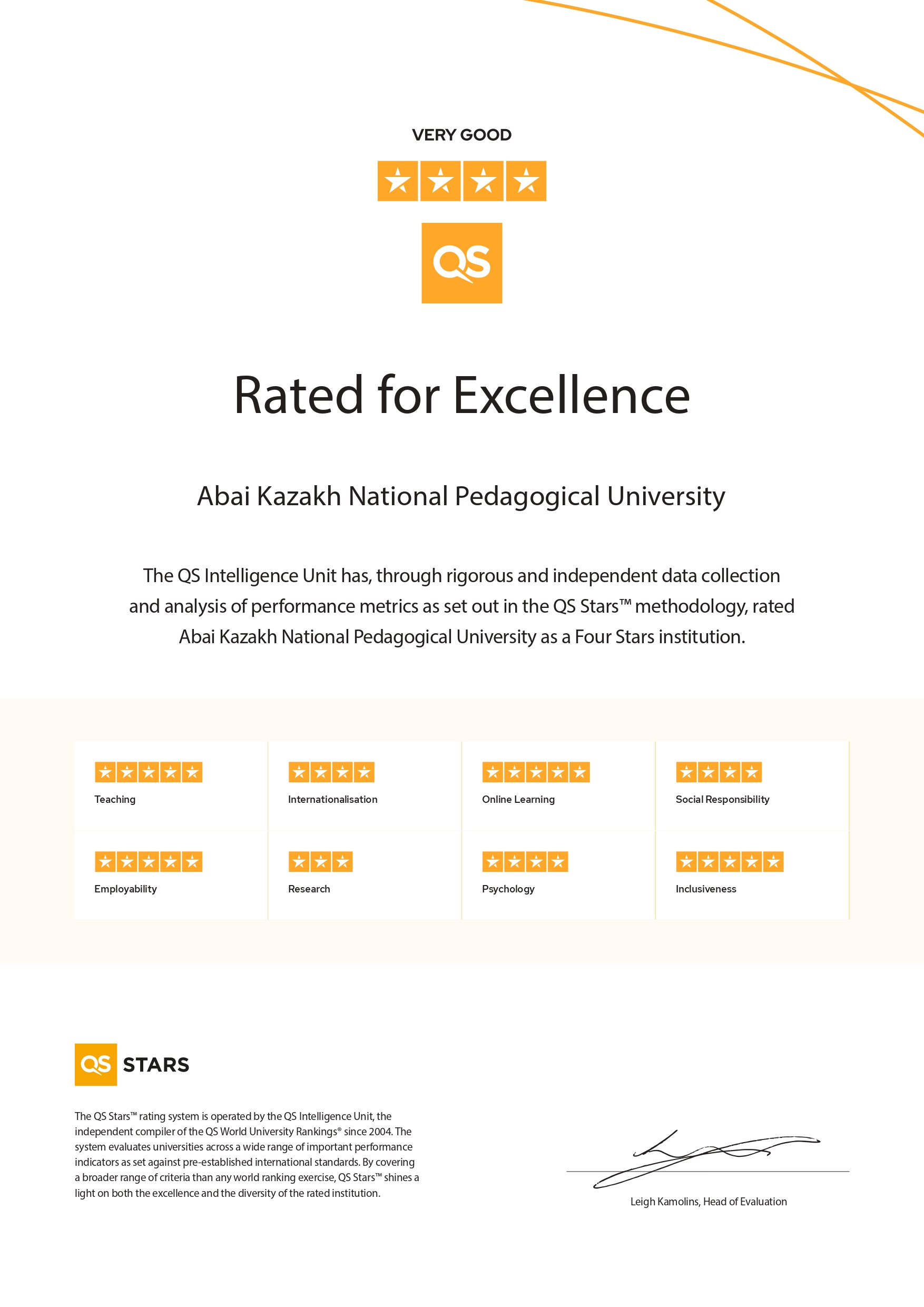 По данным рейтинга QS Stars КазНПУ им. Абая удостоен 5-и звезд по 4-м категориям: «Преподавание», «Онлайн- обучение», «Трудоустройство» и «Инклюзивность». Для любого университета эти категории особо важны, так как они охватывают основную суть его деятельности. В категории «Преподавание» оценивается соотношение студентов к ППС, удовлетворенность студентов в целом и качеством образования в том числе, а также их намерение в ближайшие годы продолжить обучение на программах магистратуры и докторантуры.