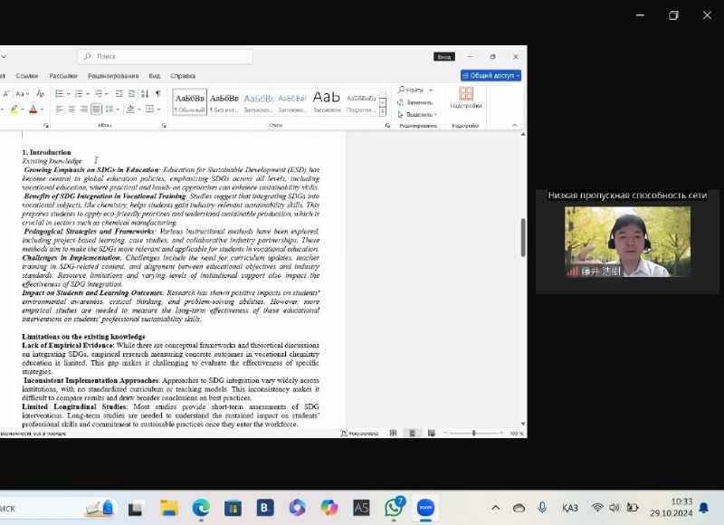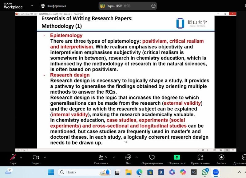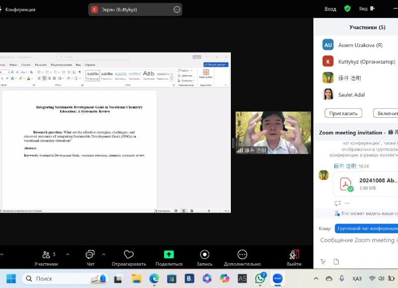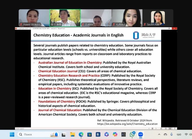 Ежемесячная консультация с профессором Хироки Фуджи из университета Окаяма (Япония) 29 октября 2024 года на кафедре химии КазНПУ имени Абая состоялась очередная онлайн-встреча с участием докторантов - Зухры Мухамбеталиевой и Куттыкыз Есимхановой - под руководством профессора Университета Окаяма (Япония) Хироки Фуджи и старшего преподавателя Асем Узаковой.