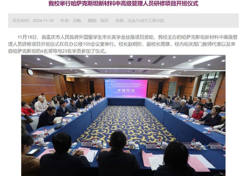 Программа «Один пояс, один путь: Шелковый путь» 18 ноября 2024 года в Чунцинском университете науки и технологий г.ЧунЦин Китай, в рамках проекта "Шелковый путь", на основе стипендии мэра Народного правительства Чунцина для иностранных руководителей среднего и высшего звена, состоялась церемония открытия курсов повышения квалификации "Новые материалы". На церемонии открытия присутствовали ректор Чунцинского университета науки и технологий Чжао Минцзе, проректор ЧунЦинского Университета - Чжоу Сюн, декан международного образования Ли Хайронг, декан металлургии и энергетики Дай Цинвэй и представители комитета высшего и послевузовского образования МОН РК Шокаев Олжас, Кудайбергенов Жандаулет. Представители делегации пожелали успешного завершения курса и отметили, что намерены работать вместе в будущем.