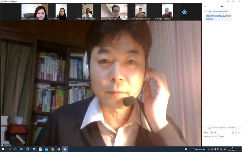 4 ноября 2021 года прошла встреча директора Центра продвижения образования в интересах устойчивого развития (ОУР) Университета Окаяма (Япония), профессора Хироки Фуджи с исследовательской группой от КазНПУ имени Абая в рамках проекта «Promoting Teacher Education for Climate Change Education through Collaboration between Asian Centres of Excellence on Education for Sustainable Development» («Содействие педагогическому образованию по вопросам изменения климата путем сотрудничества между азиатскими центрами передового опыта в области образования в интересах устойчивого развития»).