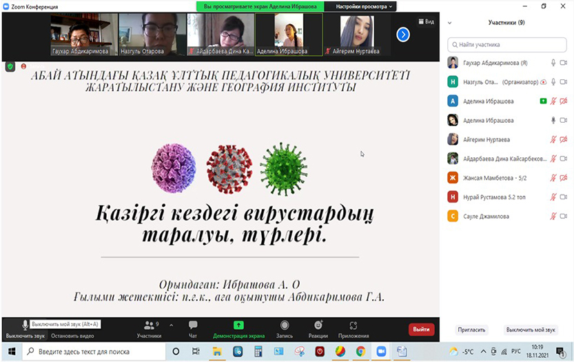 18-19 ноября 2021 года отделом биологии Института естествознания и географии КазНПУ имени Абая на платформе Zoom была проведена 76-я ежегодная традиционная конференция студентов и магистрантов. Активное участие в ней приняли ППС отделения «Биология», студенты 1-4 курсов и магистранты 1-2 курсов. Главная цель мероприятия - ознакомление с актуальными проблемами и результатами новых научных достижений в области биологии, обсуждение широкого спектра вопросов по использованию информационных технологий в науке и образовании, обмен знаниями и передовым опытом в продвижении научных взглядов студентов и магистрантов.