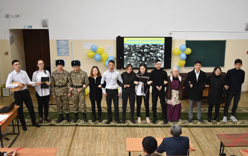 Занавес праздника открыли ведущие Жекен Акжол и Кызайбай Салтанат. В ходе воспитательного часа была показана постановка, подготовленная студентами группы в качестве фрагмента Декабрьских событий 1986 года. Студенты Толеп Гульназ, Куаныш Бедел, Абдильда Арайлым и Идрисова Акжаркын прочитали проникновенные стихи и посвящения. Жекен Акжол исполнил кюй на домбре, Солтангазина Аяулым с прекрасным пением подвела итоги воспитательного часа. В завершении мероприятия выступили Увалиев Талгат, Думан Алиаскаров и Нурлан Манапов, которые поделились своими впечатлениями о декабрьских событиях и поблагодарили студентов.