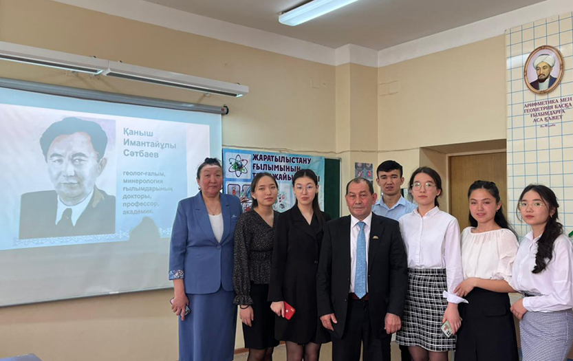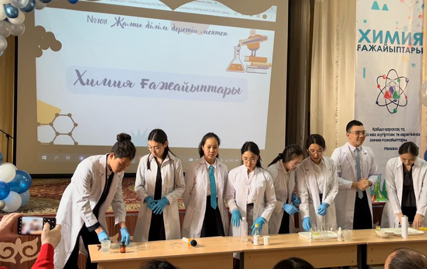 12 апреля 2022 года студенты 3-го курса специальности «6В01512-Химия-Биология» Института естествознания и географии Абил Тугельбек, Балибаева Айгерим, Садыков Асхат, Сапина Сымбат, Сисенбаева Айгерим, Толеген Акбота и Уласанова Дильназ провели в школе №108 вечер «Чудеса химии», посвященный Дню работников науки и дню рождения выдающегося ученого, академика Академии Наук СССР К.И.Сатпаева.