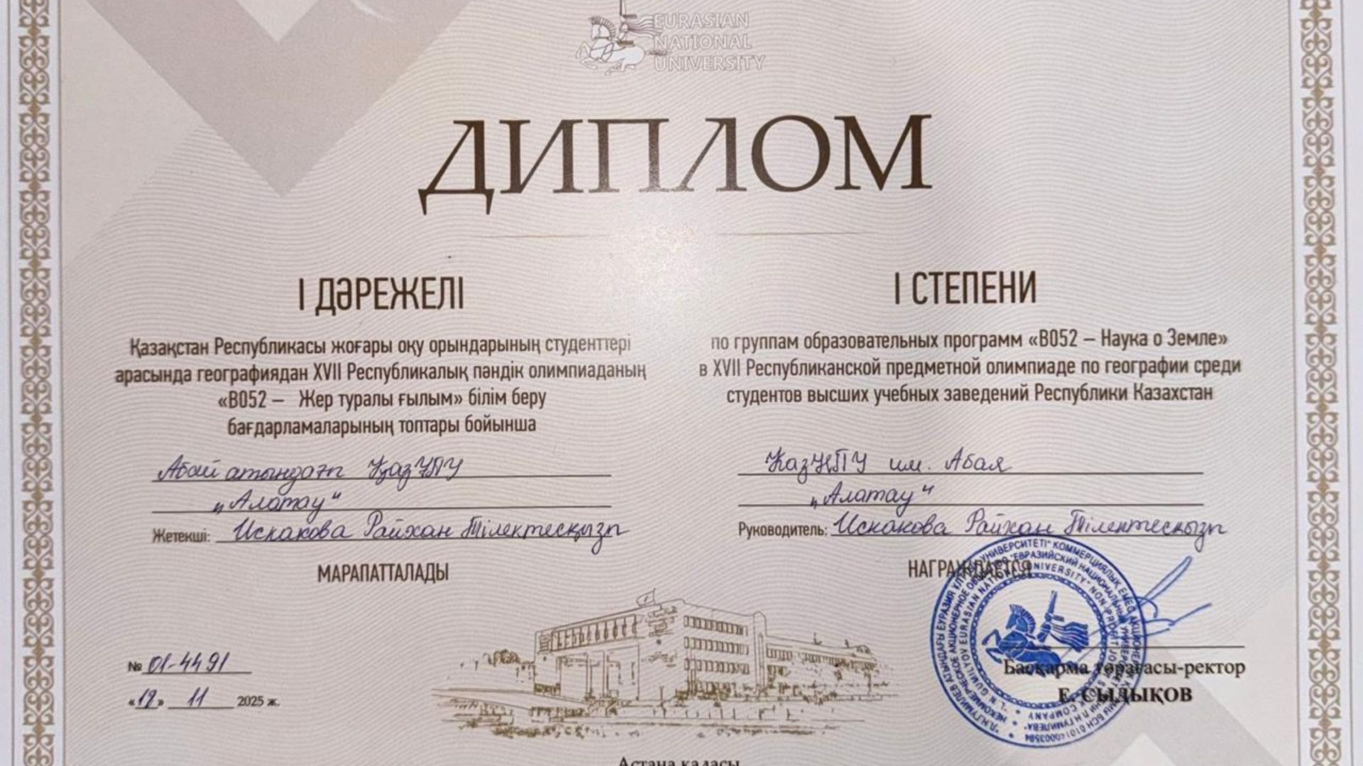 XVII Республиканская предметная олимпиада студентов по направлению «В052 - Науки о Земле» прошла 18-19 ноября в г. Астана, в Евразийском национальном университете имени Л.Н. Гумилева. Команда «Алатау», состоящая из студентов факультета естественных наук и географии, кафедры географии и экологии, специальности 6В05203-География, прорвала группу и вновь заняла 1-е место. Быть признанными «отличными» второй год подряд и быть узнанными издалека - большая честь.