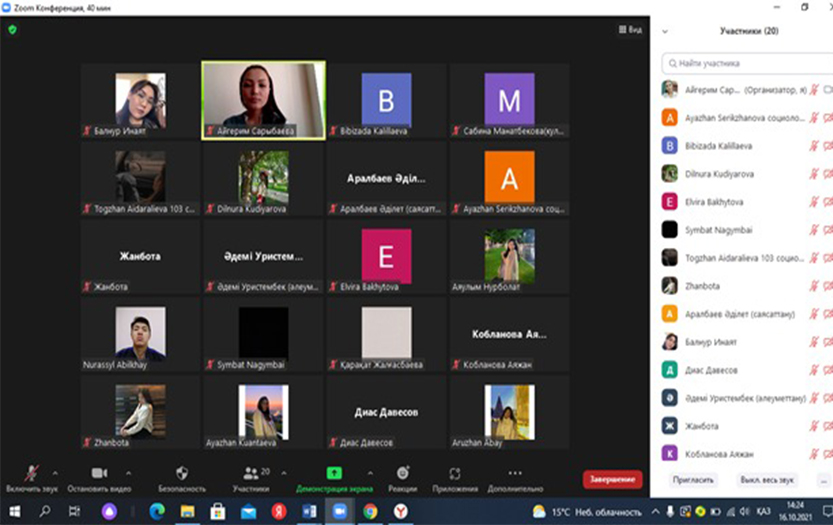 16 октября 2021 года Сарыбаева Айгерим, эдвайзер-преподаватель специальностей «Культурология», «Социология», «Политология» кафедры политологии и социально-философских дисциплин Института истории и права, провела на платформе Зум познавательно-воспитательный час «Успешная сессия - главное требование!». На мероприятии были затронуты вопросы посещаемости, успеваемости и дисциплины студентов. А.Б.Сарыбаева подвела итоги воспитательного часа и пожелала студентам удачи в предстоящем промежуточном контроле.