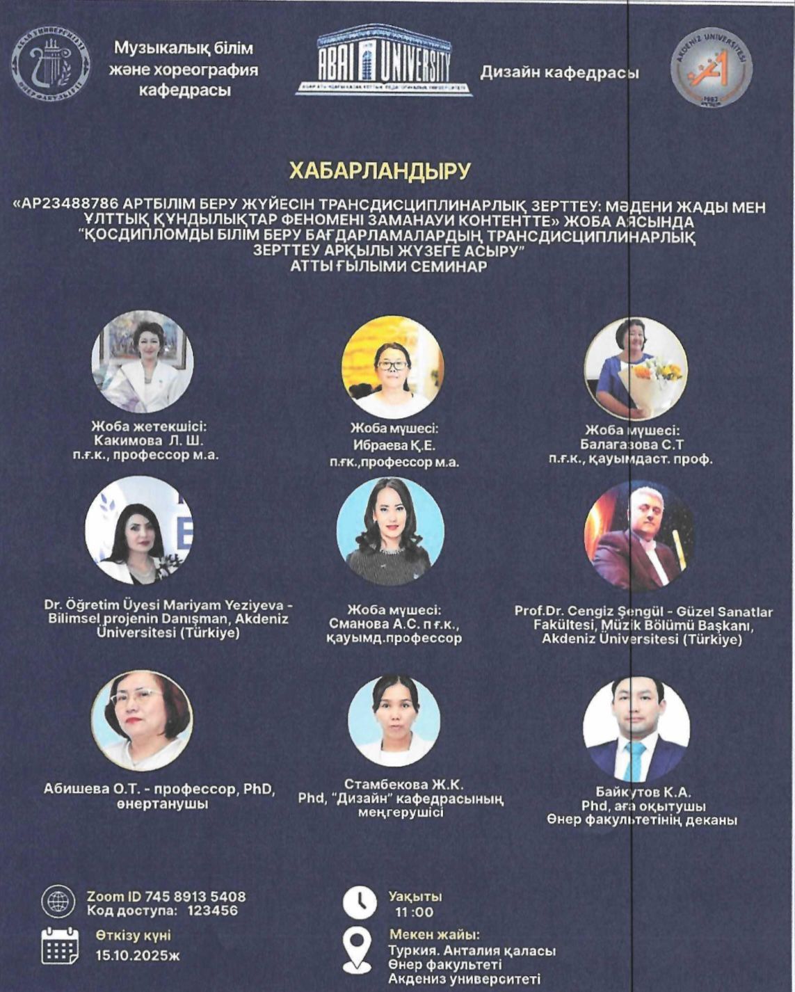 В период 13-19 октября 2025 года в рамках научного проекта АР234888786 «Трансдисциплинарное исследование в системе артобразования: культурная память и феномен национальных ценностей в современном контенте» ППС кафедры музыкального образования и хореографии к.п.н., и.о.профессора Какимова Л.Ш. (руководитель), к.п.н.,и.о.профессора Ибраева К.Е., к.п.н., ассоц.профессор Балагазова С.Т. посетили факультет изящных искусств университета Акдениз (Анталья, Турция)