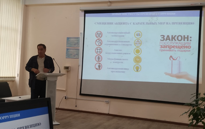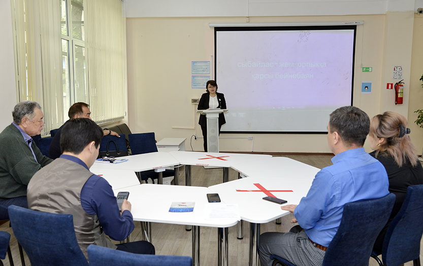 There was also organized a book exhibition "Honesty and Integrity is a Sign of Humanity". The event was attended by: the head of the anti-corruption compliance service Serikbay Nurgisaev, chairman of the Council of Veterans Berikzhan Almukhambetov, director of the Scientific Library Nurgul Imansydykova, acting director of the Institute of Mathematics, Physics and Informatics Sheripidin Khamraev, deputy director for educational work Zhasulan Mukashev, students and staff of the library. A video "There is no corruption in our society" was shown. Professor S. U. Nurgisaev presented the scientific library with his books. Participants of the event showed great interest in the topic raised, shared their thoughts and had a lot of impressions.