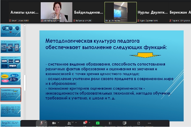 Спикером выступила профессор К.К.Жампеисова, она разъяснила сущность, содержание, уровни методологии, проблемы формирования методологической культуры. В ходе обсуждения ключевых моментов семинара выступили заведующая кафедрой, профессор Ш.Ж.Колумбаева, декан педагогического факультета Ферганского государственного университета (Узбекистан) Бекзод Байджанов, старший преподаватель Б.Б.Атабекова. Руководитель семинара, профессор-исследователь А.Е.Берикханова акцентировала внимание участников на значимости методологических знаний для интеграции теории и практики обучения и воспитания.