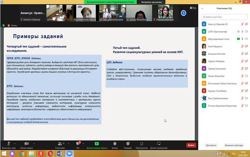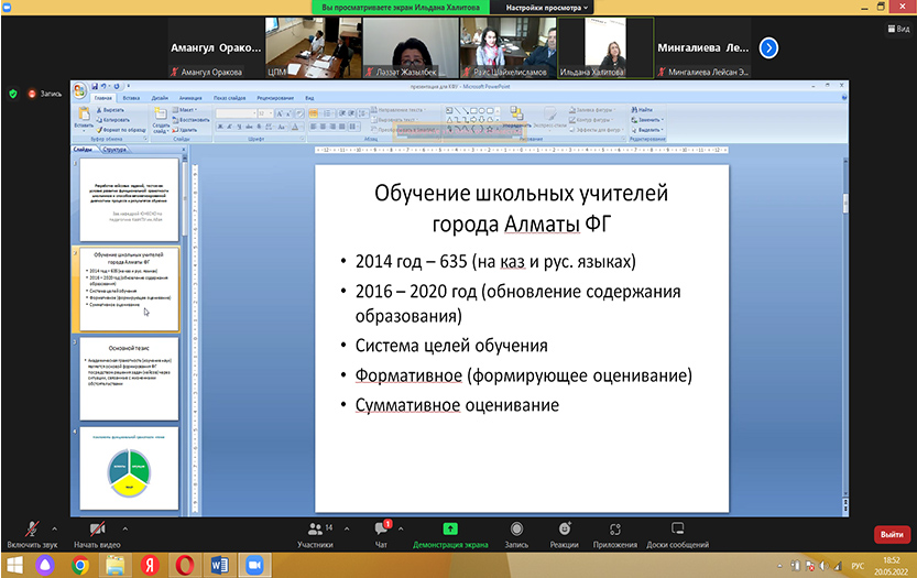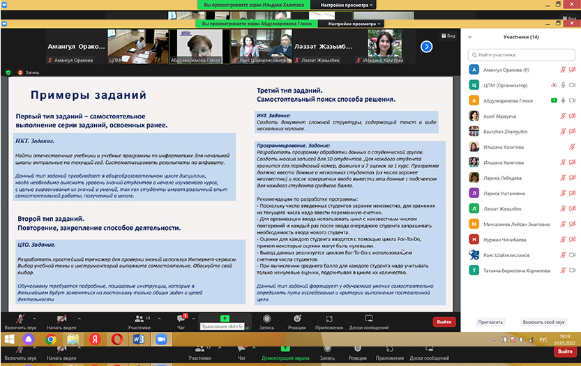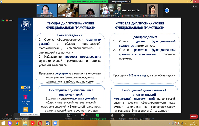 20 мая 2022 года Центр преподавательского мастерства КазНПУ имени Абая и Центр непрерывного профессионального развития педагогов Республики Татарстан (РТ) Казанского федерального университета провели онлайн-встречу на тему «Архитектура цифровой платформы автоматизированной диагностики функциональной грамотности школьников».