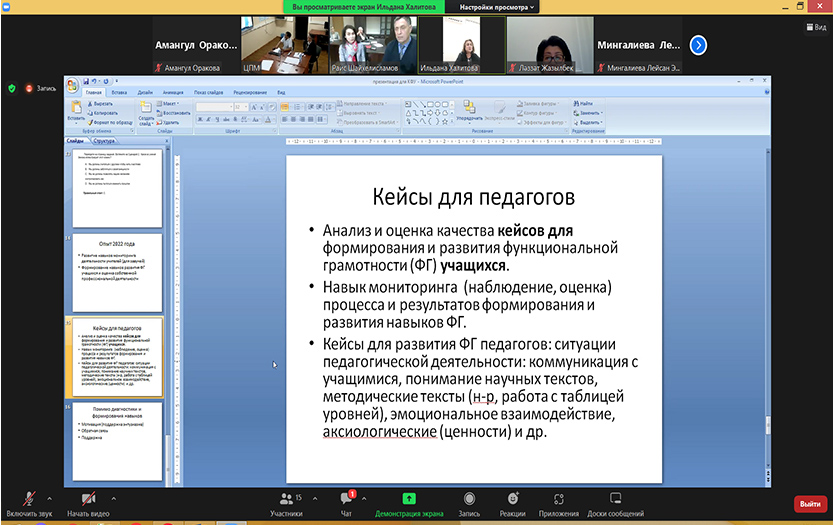 5. Разработка кейсовых заданий, тестов для автоматизированной диагностики развития функциональной грамотности школьников: И.И.Халитова, заведующая кафедрой ЮНЕСКО и Г.А.Абдулкаримова, доцент Института математики, физики и информатики КазНПУ им. Абая. В рамках темы «Разработка кейсовых заданий, тестов как условие развития функциональной грамотности школьников и способов автоматизированной диагностики процесса и результатов обучения» они поделились педагогическим опытом, результатами научных исследований.