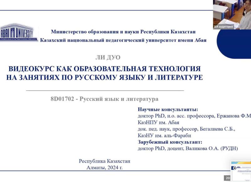 На расширенном заседании кафедры русского языка и литературы факультета филологии КазНПУ имени Абая состоялось обсуждение диссертационной работы «Видеокурс как образовательная технология на занятиях по русскому языку и литературе», подготовленной докторантом Ли Дуо для получения степени доктора философии (РhD) по образовательный программе «8D01702-Русский язык и литература».