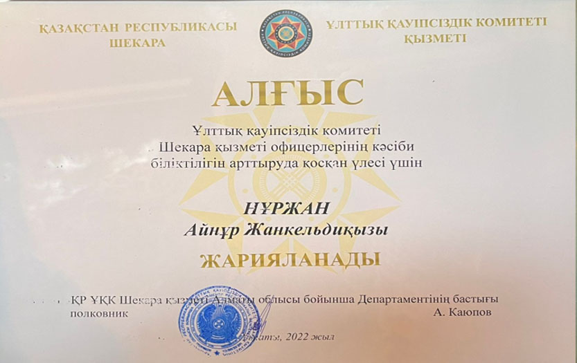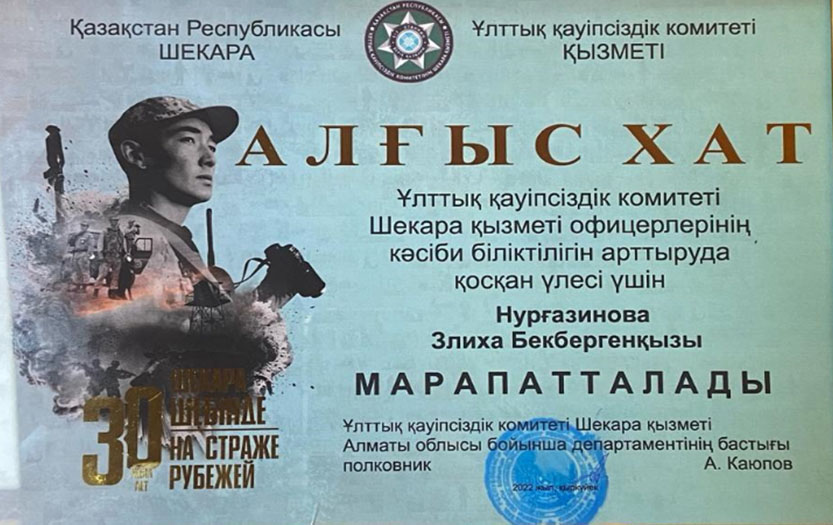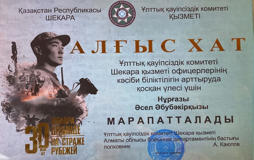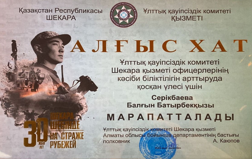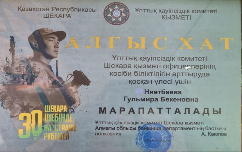 Слушатели семинара поделились положительными отзывами, сделав особый акцент на подачу материала по психологическому развитию личности офицеров. В завершении мероприятия магистранты-психологи были награждены Благодарственными письмами Департамента Пограничной службы КНБ РК, профессор Г.Б.Ниетбаева - Благодарственным письмом и юбилейной медалью «30 лет Пограничной службе КНБ РК».