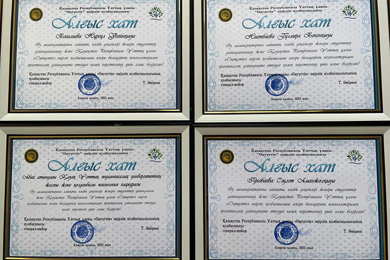 В завершение мероприятия преподаватели кафедры «Общая и прикладная психология» Г.Б.Ниетбаева, С.А.Тукебаева и Н.У.Бегалиева, оказавшие помощь в практической подготовке психологов воинских частей, специалистов с высоким профессиональным уровнем, были награждены Благодарственными письмами.