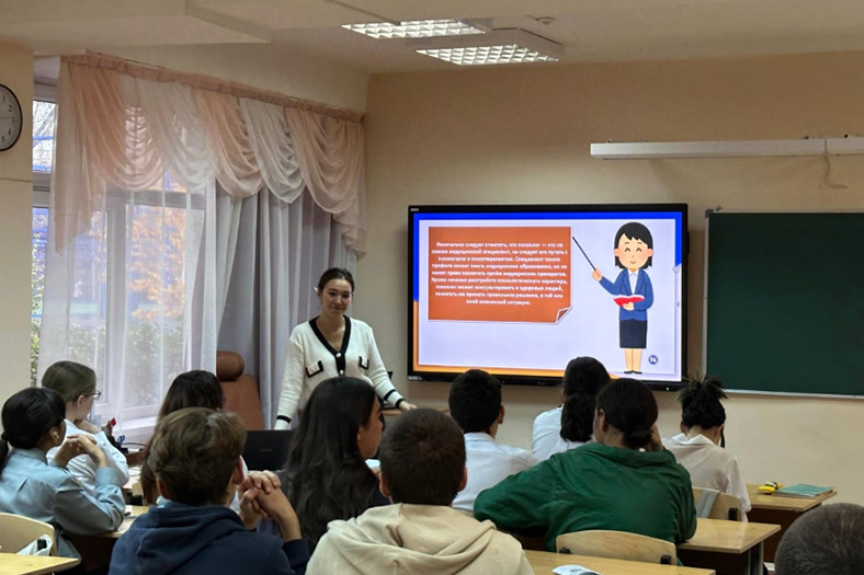 В ходе профориентационной работы, организованной институтом, доцент кафедры Тусубекова Кунслу выступила с ознакомительной речью и предоставила возможность проведения подобного мероприятия магистрантке 2-го курса Ботатаевой Акжан. Она рассказала школьникам о специальности «Психология», показала видеоролик с оснащенными кабинетами и учебно-исследовательской лабораторией «Психологическая диагностика личности». Также магистрантка провела с учащимися мини-тренинг с упражнениями, которые заинтересовали учащихся и послужили стимулом для дальнейшего изучения психологии. В результате несколько учащихся изъявили желание обучаться в будущем по специальности «Психология» и записались на консультацию для поступления в институт в 2024 году.