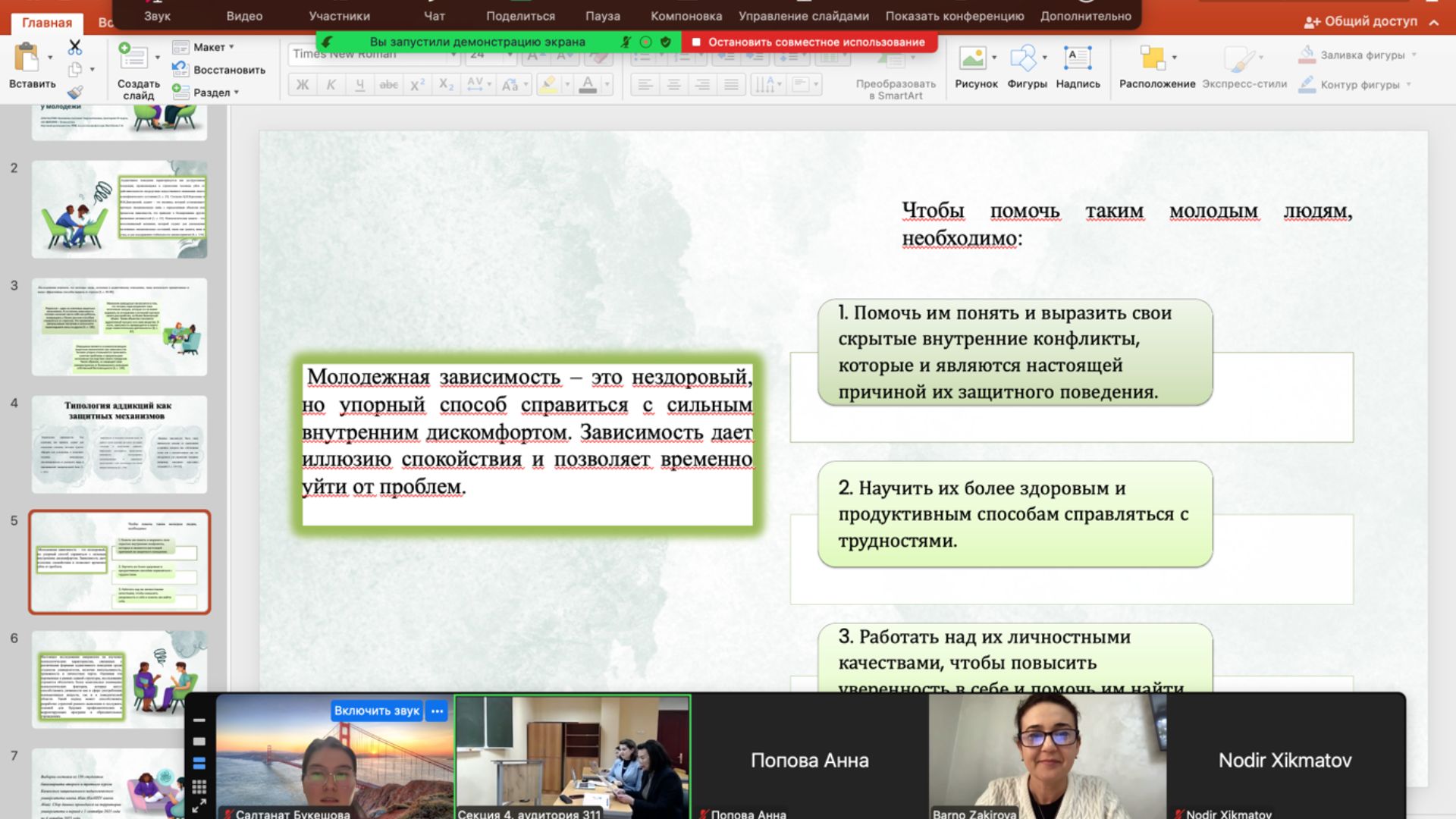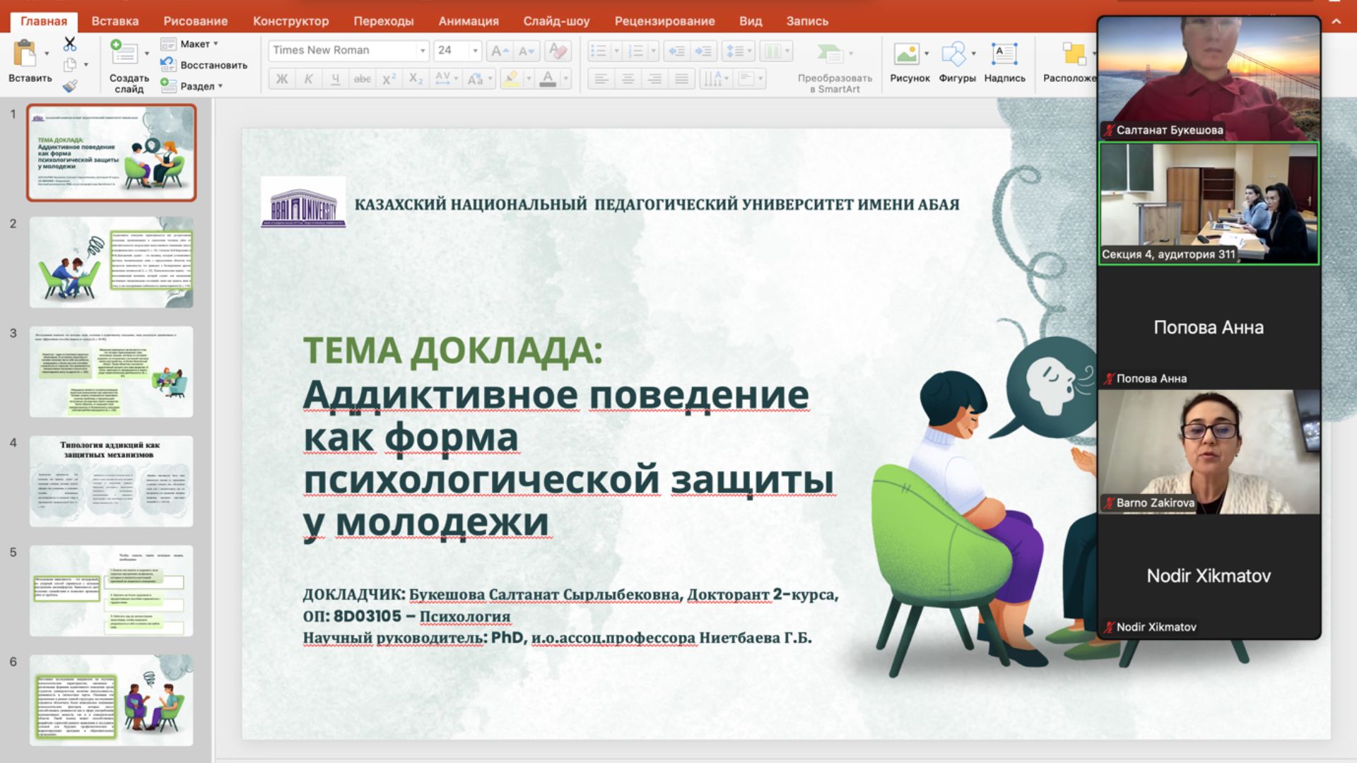 19 декабря 2025г. докторант 2-курса ОП: 8D03105 - Психология Букешова С. сделала доклад на VIII МЕЖДУНАРОДНОЙ НАУЧНО-ПРАКТИЧЕСКОЙ ОНЛАЙН-КОНФЕРЕНЦИИ «ПРОФЕССИОНАЛЬНОЕ СТАНОВЛЕНИЕ ЛИЧНОСТИ: ГЛОБАЛЬНЫЕ ТРЕНДЫ В ФОРМИРОВАНИИ КОМПЕТЕНЦИЙ XXI ВЕКА» посвящённая году охраны окружающей среды и «зеленой» экономики и 20-летию Филиала МГУ имени М.В. Ломоносова в городе Ташкенте с тема доклада «Аддиктивное поведение как форма психологической защиты у молодежи». Научный руководитель: PhD, и.о.ассоц.профессора Ниетбаева Г.Б. Во врема доклада были представлены результаты исследования которая проводилась в рамках исследовательской практики. Тема исследования заинтересовала организаторов и участников конференции. По итогу научной конференции научная статья докторанта принята для публикации в І том сборника.