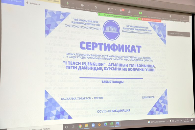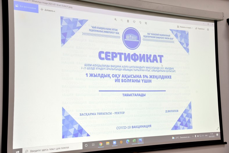 В соответствии с поручением министра образования и науки РК Асхата Аймагамбетова по стимулированию вакцинации в целях защиты здоровья студентов и на основании Постановления Главного государственного санитарного врача страны от 1 июля 2021 года № 31 в КазНПУ имени Абая с 1 июля по 25 августа 2021 года объявлены розыгрыши среди студентов, получивших первый компонент вакцины против COVID-19. Так, были разыграны следующие призы: