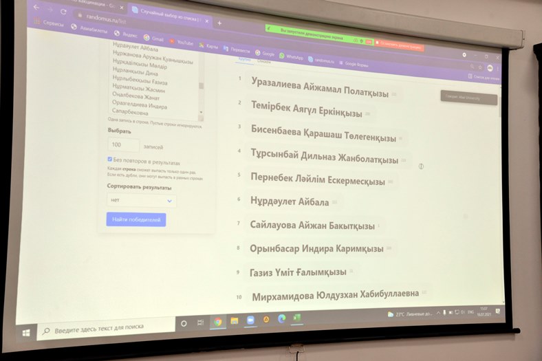 Победители были выявлены методом генератора случайных чисел https: randomus.ru/list , в результате розыгрыша 50 студентов выиграли путевки на отдых в Капчагае, 60 студентов получили сертификат на бесплатный курсы английского языка и 100 студентов получили скидку 5% на годовую плату за обучение.
