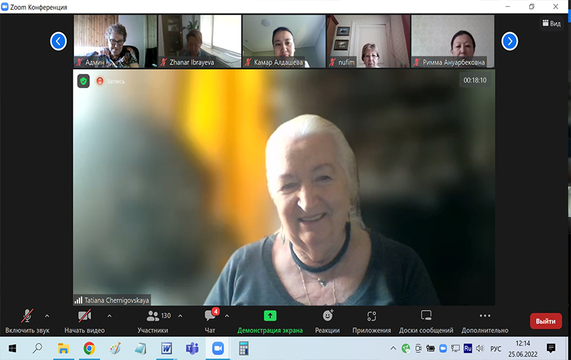 25 июня 2022 г. на базе Института языкознания им. А. Байтурсынова совместно с Институтом когнитивных исследований (Санкт-Петербургский государственный университет) на Научно-образовательной площадке секции Психолингвистики «Язык и сознание» прошло первое заседание. Спикерами этой научной встречи были ведущие психолингвисты и когнитологи из Москвы и Санкт-Петербурга. Модератором выступила доцент кафедры русского языка и литературы Института филологии КазНПУ им. Абая Мадина Абаева.