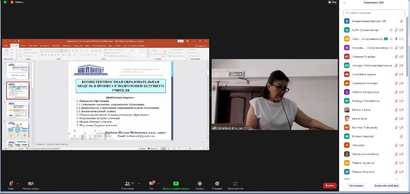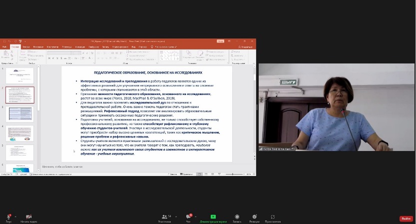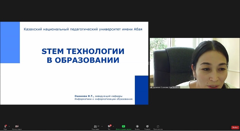 Заведующий кафедрой информатики и информатизации образования, к.п.н., доцент Ошанова Н.Т. проанализировала передовые технологии STEM, подчеркнула их ценность и значимость, председатель академического комитета Института естествознания и географии, к.п.н., доцент Карбаева Ш.Ш. отметила глобальные тенденции современного образования, компетентность образовательной модели в процессе подготовки будущего учителя, кафедры истории Казахстана им. Т.С. Садыкова, к.т.н., старший преподаватель Нурман Ш.Т. поделилась опытом по теме: «Педагогическое образование, основанное на исследованиях».