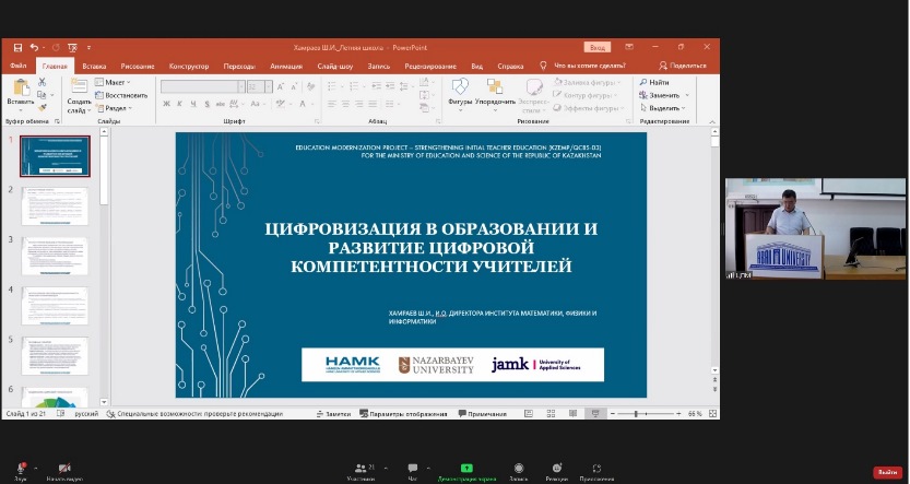 Вопросы, рассмотренные в рамках сессии Летней школы 29 июня, вызвали большой интерес научной аудитории, в частности: к.и.н., доцент Хамраев Ш.И. «Цифровизация в образовании и развитие цифровой компетентности учителейй»; к.п.н., Рабилова З.Ж. «Проектирование по принципу конструктивноого соглосования»; PhD, старший преподаватель, Нурбаева Д.М. «Предметно-языковое интегрированное обучение (CLIL)»; магистр, старший преподаватель Н.Тулегеновұлы «Профессиональное развитие учителей и управление изменениями»; магистр, старший преподаватель Е.А.Жалмагамбетов «Междисциплинарное обучение».